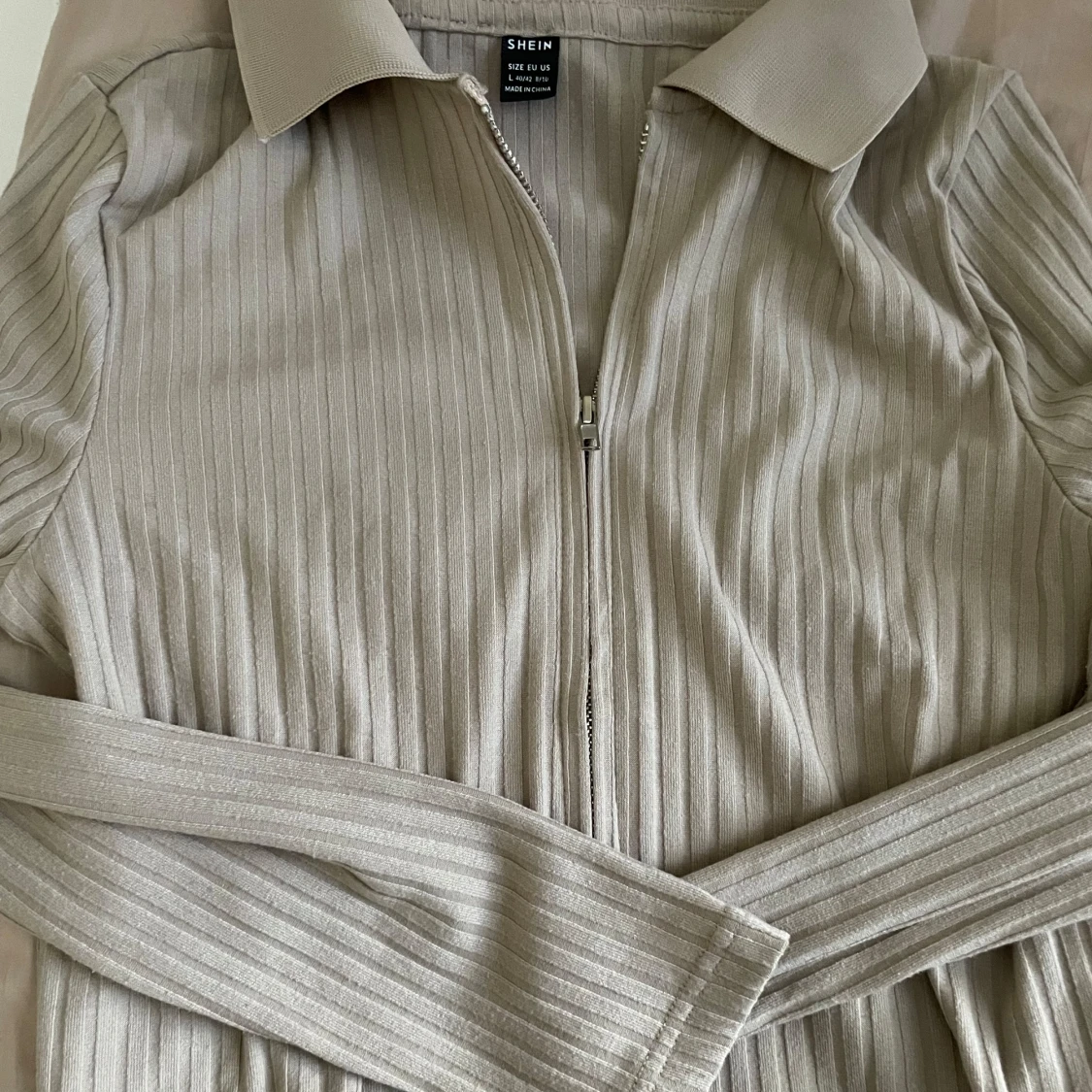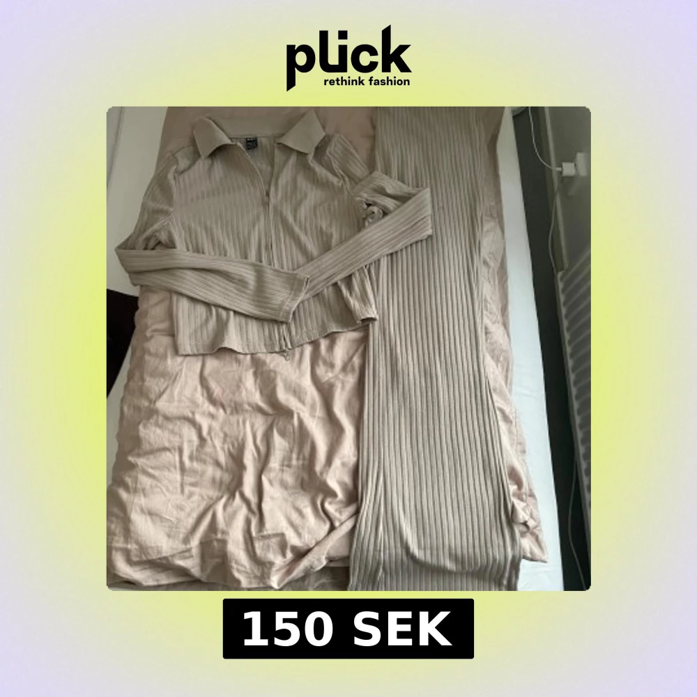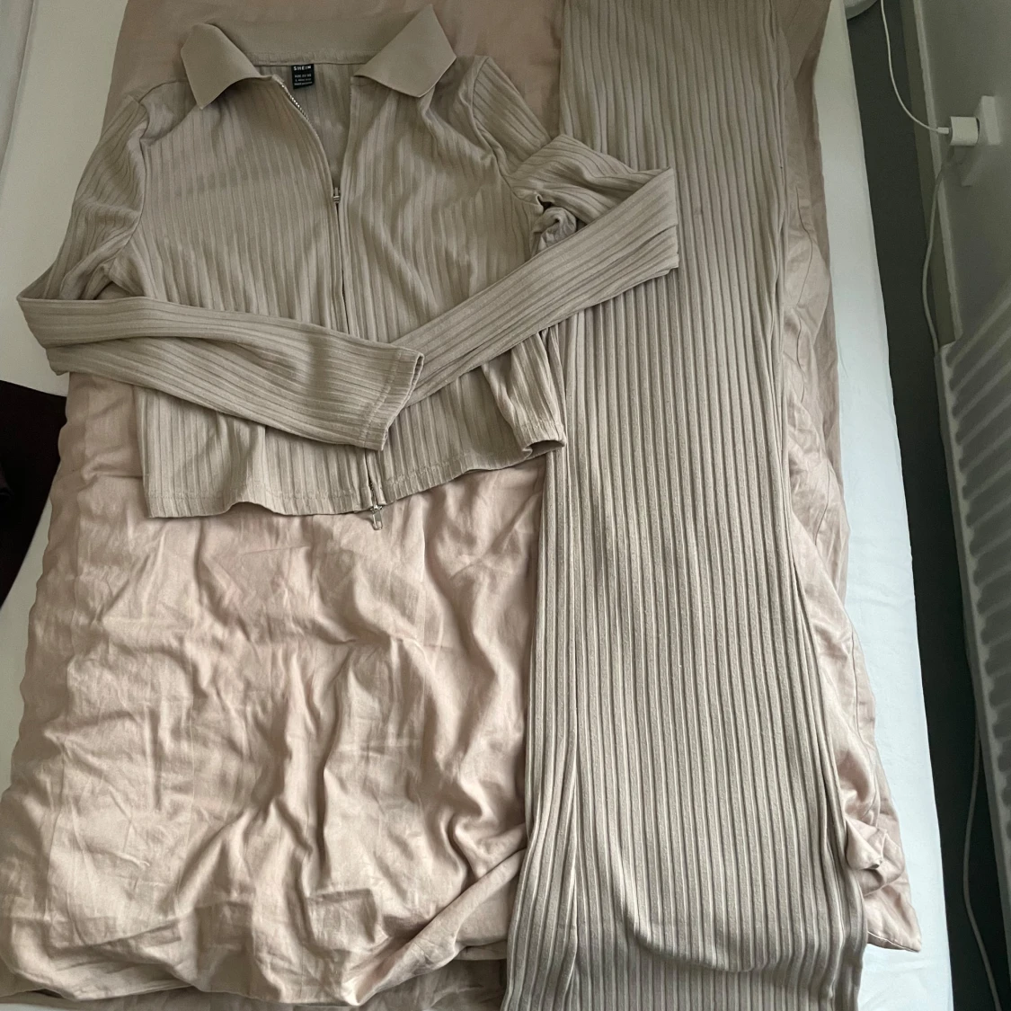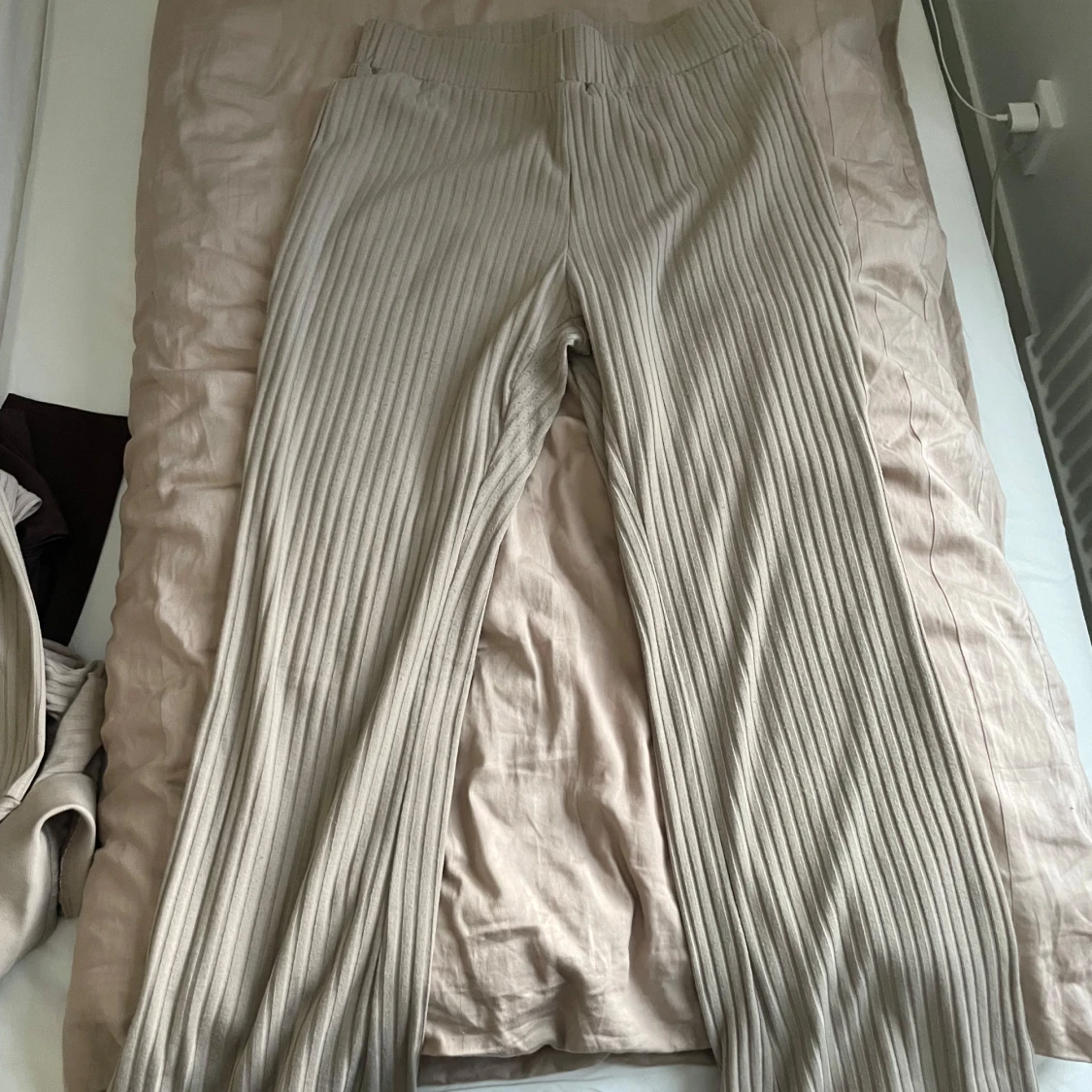 Säljer ett par beige ribbade byxor från SHEIN tillsammans med tröjan. Byxorna har en rak och loose passform med hög midja och är tillverkade i ett mjukt, stretchigt material. Perfekta för en avslappnad och trendig look.