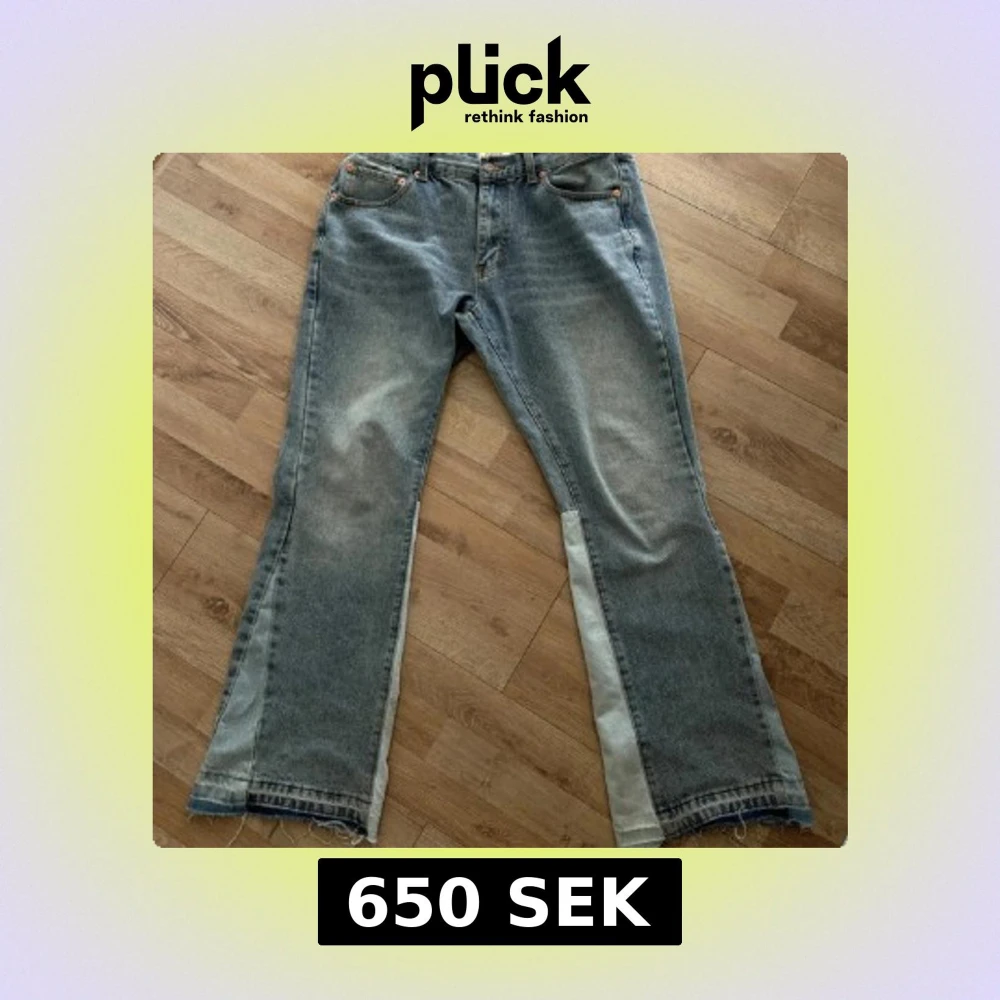 Unika ljusblå jeans från Gallery Dept. med bootcut-snitt och råa kanter nertill. Byxorna har kontrasterande ljusare paneler längs benen och klassisk femficksdesign. Tillverkade i kraftig denim med cool vintagekänsla och tydliga detaljer.