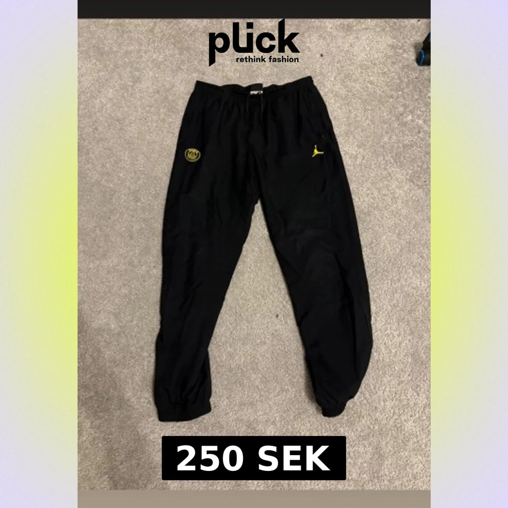 Svarta mjukisbyxor från Jordan och PSG med gula loggor på framsidan. Byxorna har resår i midjan och vid bensluten för en skön passform. Perfekta för chill eller sport. Materialet är mjukt och bekvämt.