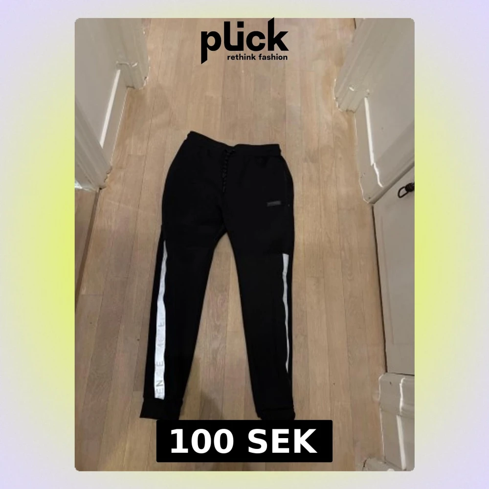 Svarta mjukisbyxor från McKenzie i storlek L. Passar storlek M. Byxorna har vita ränder längs benen och polyester material