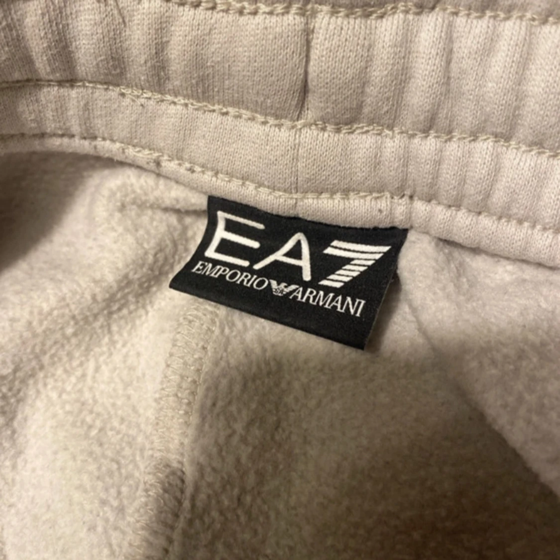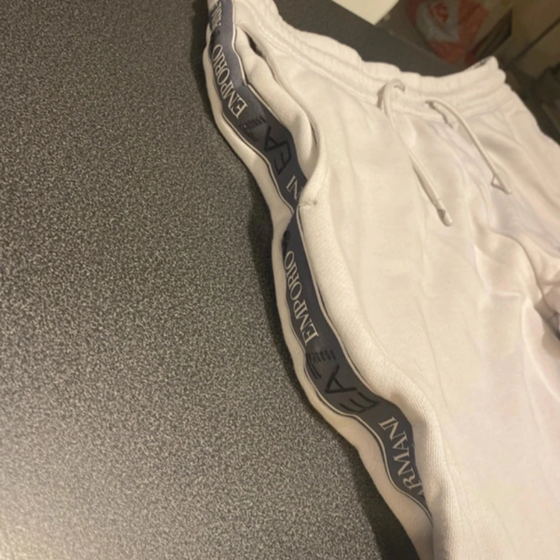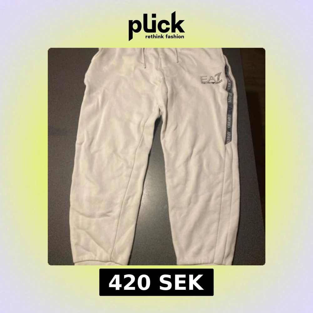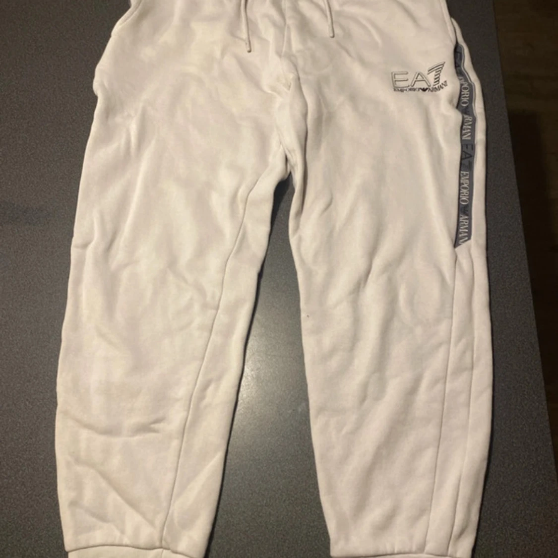 Snygga vita mjukisbyxor från EA7 Emporio Armani med logga på benet och breda svarta sidoremsor med text. Byxorna har dragsko i midjan och muddar vid bensluten. Perfekta för en chill och sportig look ny pris 800kr.