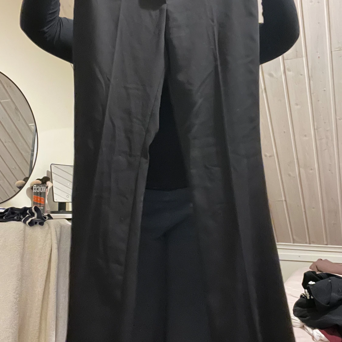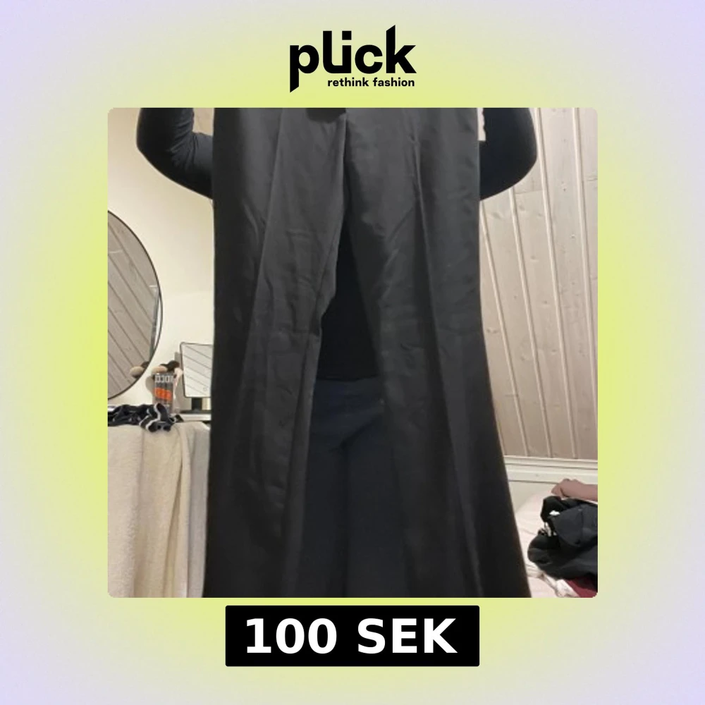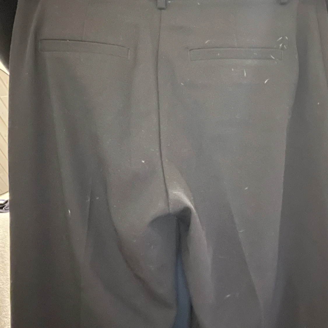 Säljer ett par svarta kostymbyxor med vida ben och klassiska bakfickor. Byxorna har hällor för bälte och är i ett stilrent snitt som ger en clean look. Perfekta om du gillar en loose och relaxed vibe.tvättas vid försäljning