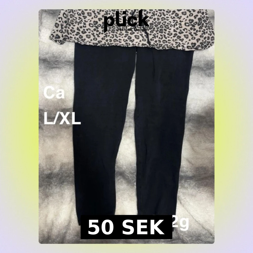 Svarta leggings, perfekt för dig som vill ha bekväma och tajta byxor. Passar dig som gillar enkel och stilren look. Snygga att matcha med en oversized hoodie eller t-shirt.🌸 Två små fläckar på insidan kanten. Finns en ficka på baksidan. Storlekslapp borta men uppskattar till L/XL