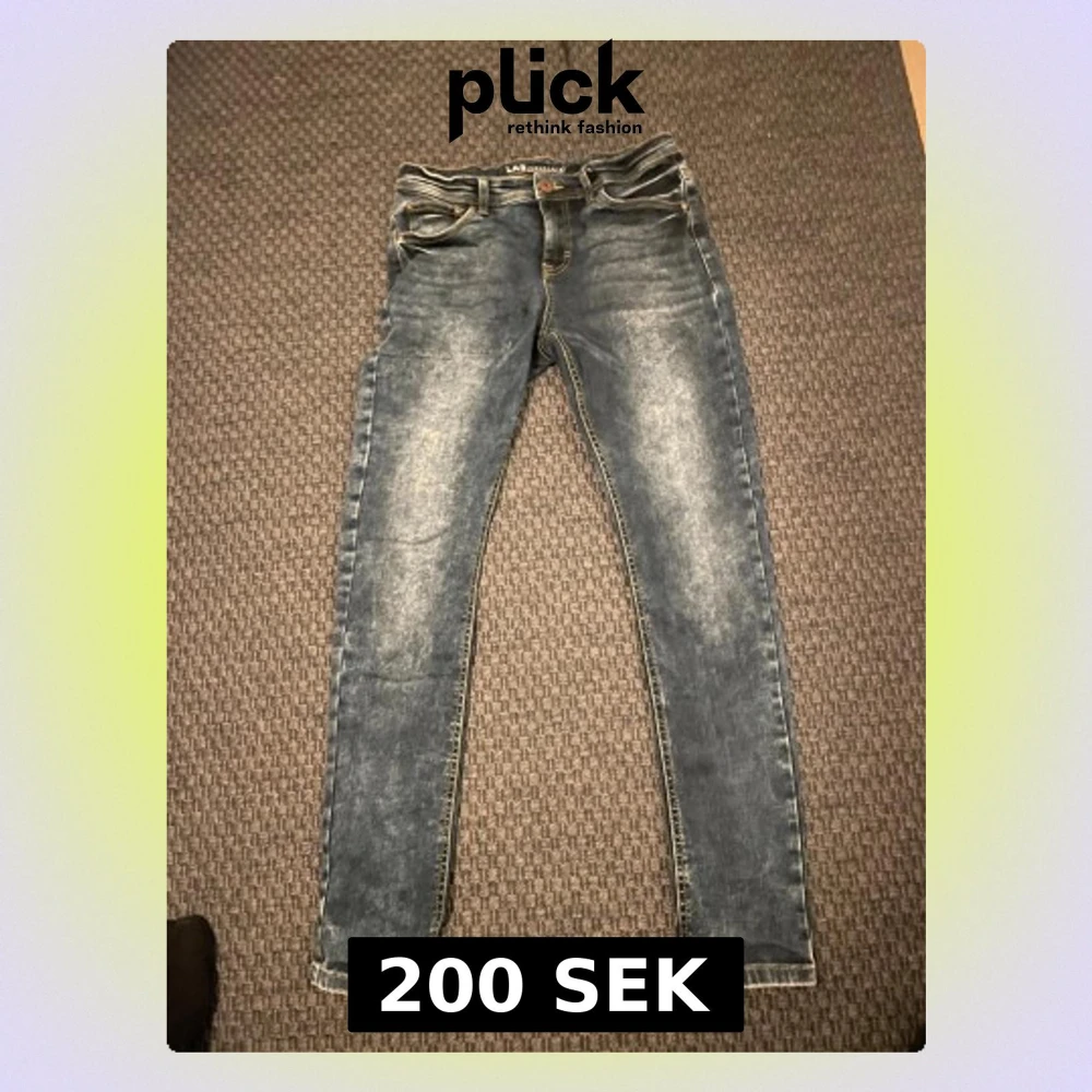 Säljer ett par blå skinny jeans från LAB Industries i storlek 164. Jeansen har en snygg tvättad look med ljusare partier och klassiska fickor både fram och bak. Perfekta för dig som gillar en tight passform och stilren denim.