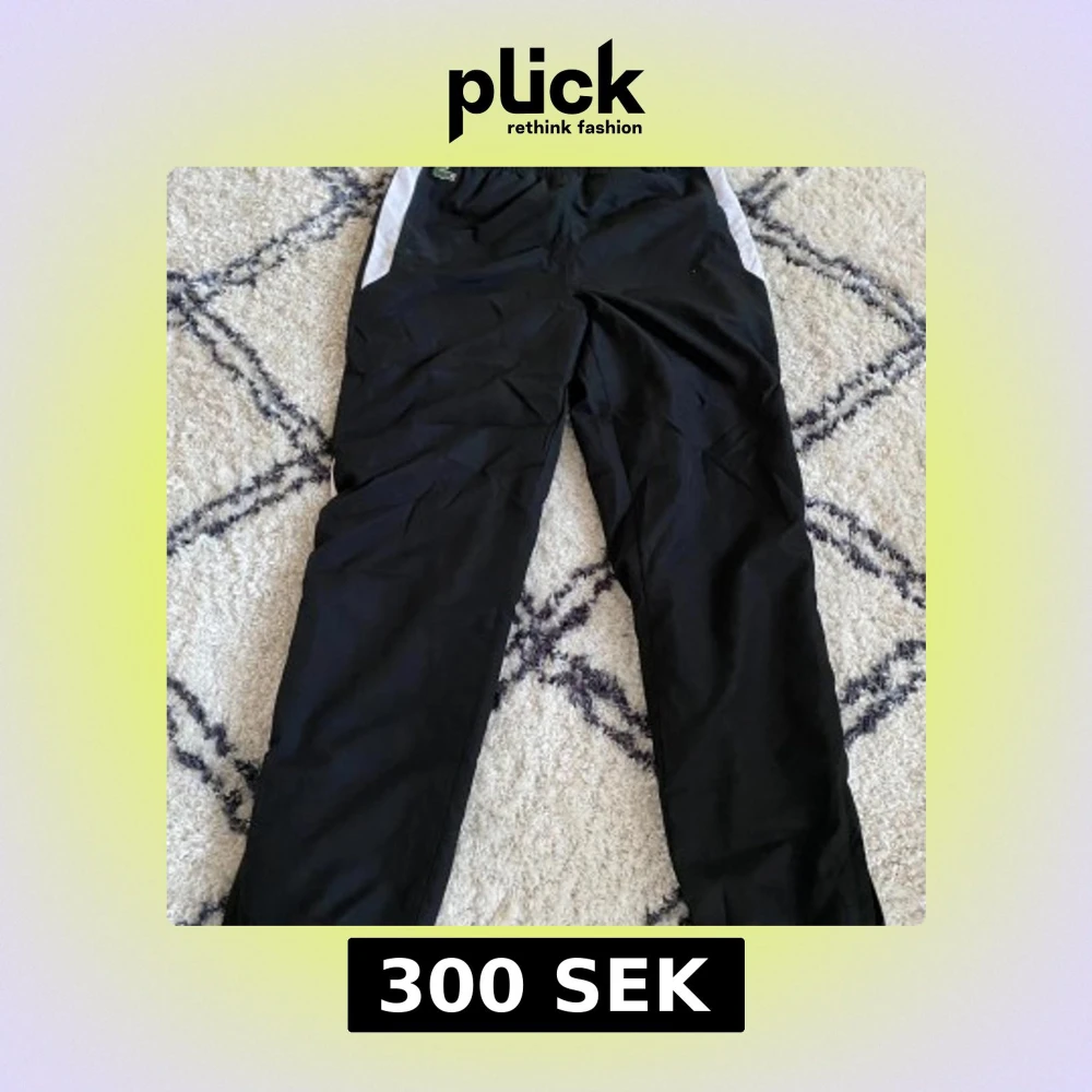 Säljer ett par svarta träningsbyxor från Lacoste med vita detaljer längs sidorna. Byxorna har elastisk midja och är perfekta för sportiga aktiviteter. Lacoste-loggan syns tydligt på sidan.