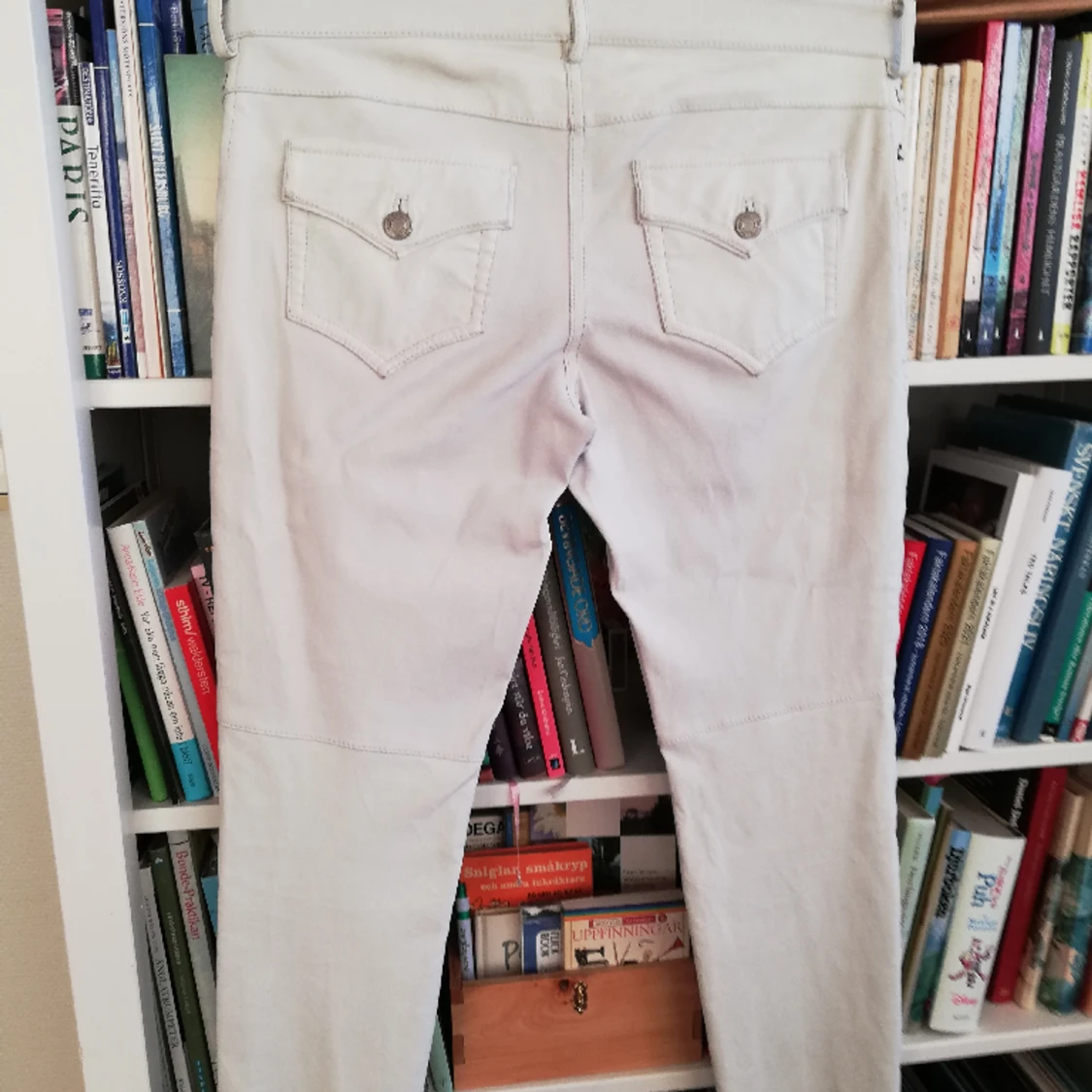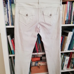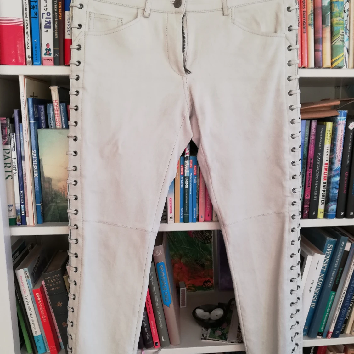 Mjuka fräcka vita skinnbyxor med snörning i sidorna. Då de är vita så finns det antydningar till visst slitage/smuts.