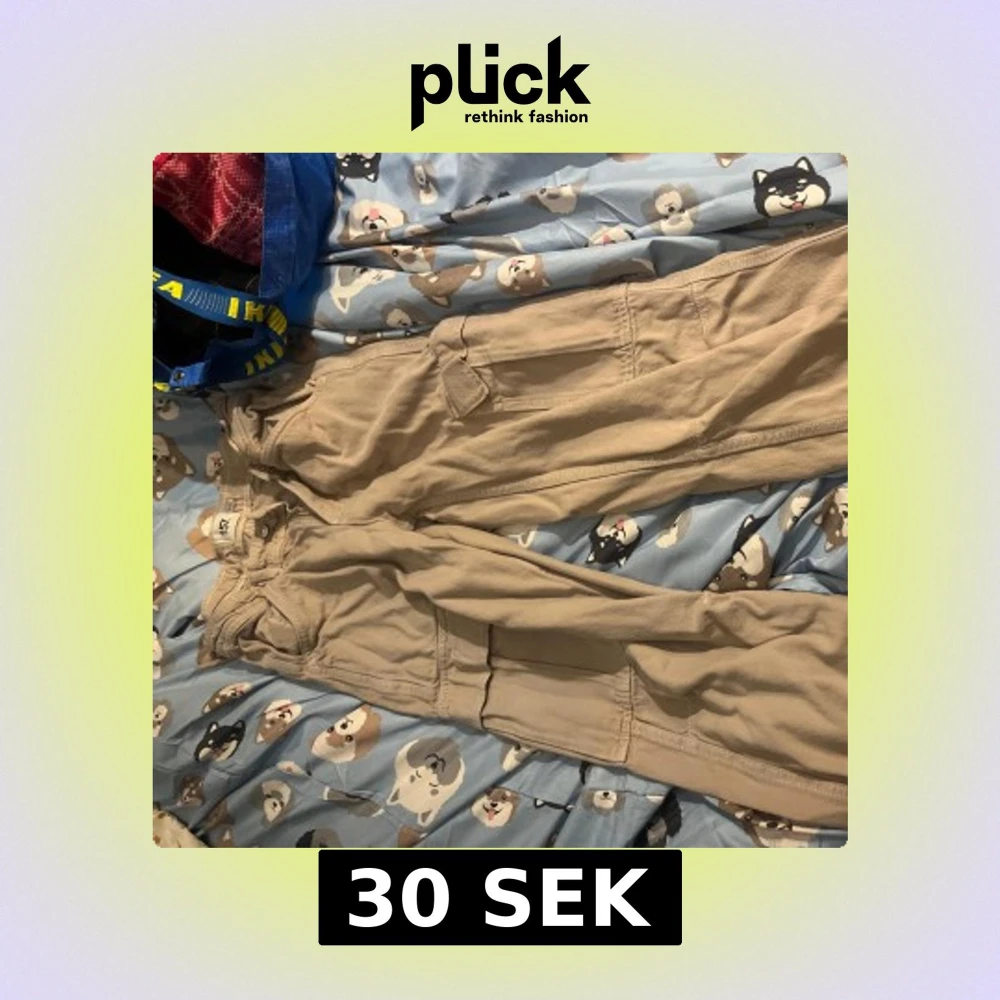 Säljer ett par beige cargopants från 157 i storlek 160. Byxorna har flera praktiska fickor på sidorna och bak, samt dragkedja och knapp framtill. Materialet är mjukt och känns som bomull, med en loose passform och klassisk cargostil.
