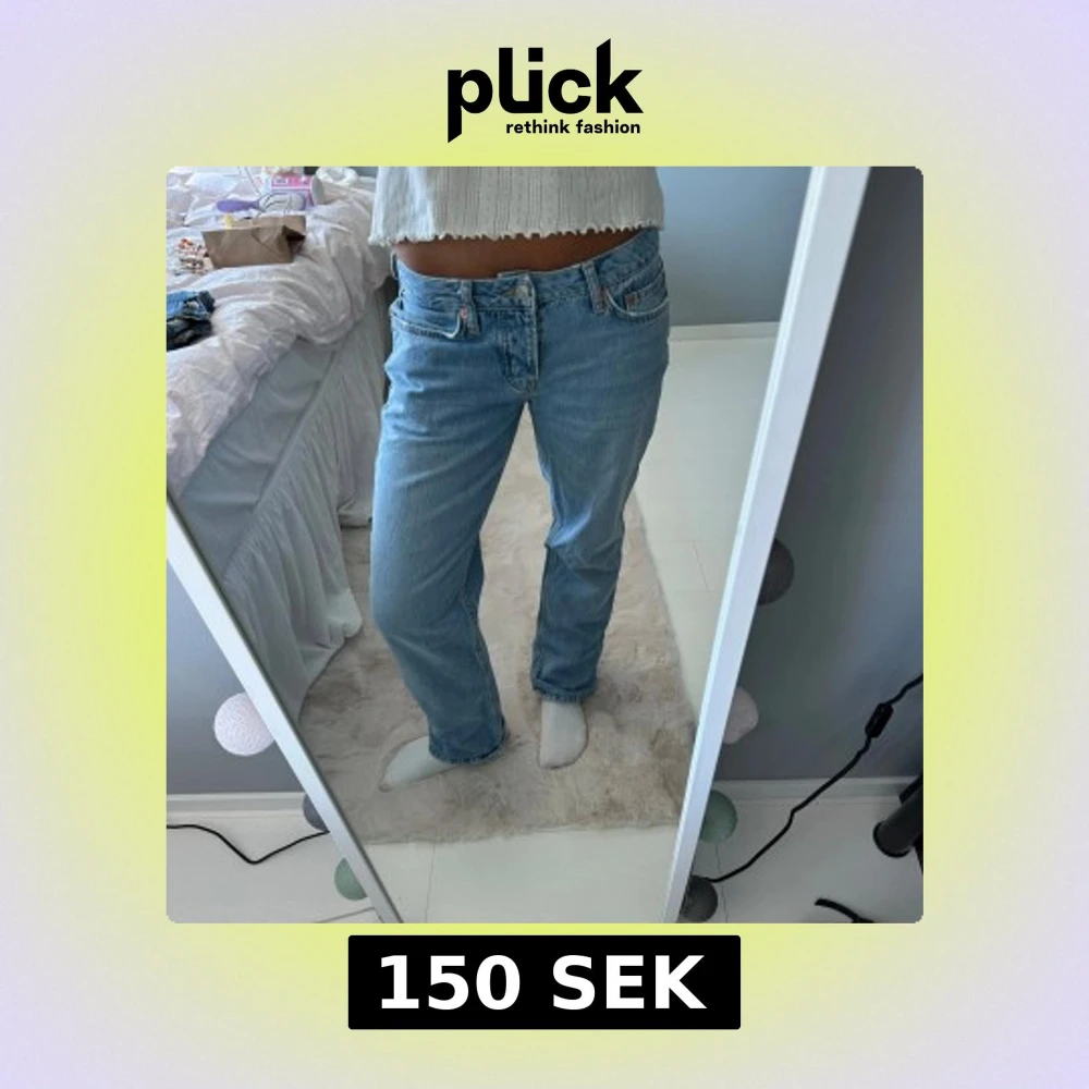 Säljer ett par klassiska jeans i ljusblå tvätt. Modellen har rak passform, fem fickor och knappgylf. Jeansen sitter midwaist och är tillverkade i slitstarkt bomullsdenim. Perfekta för en chill och avslappnad stil.