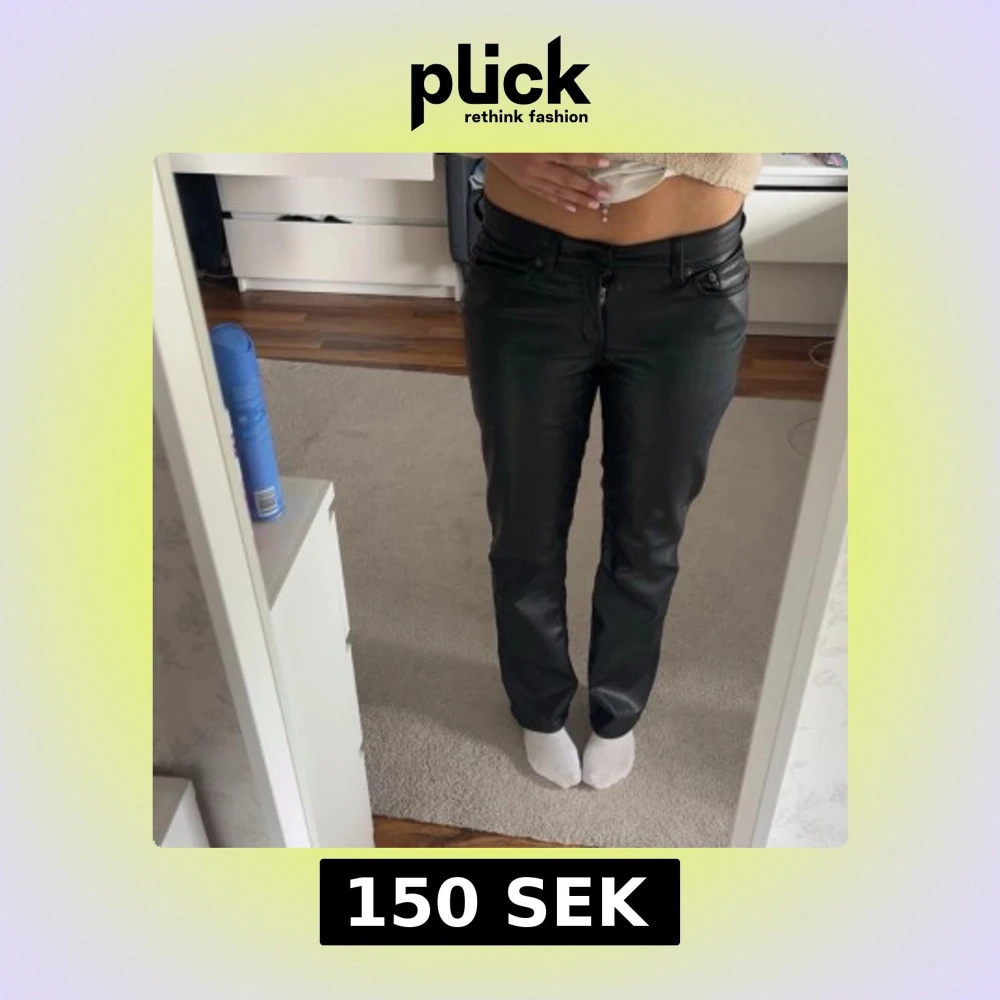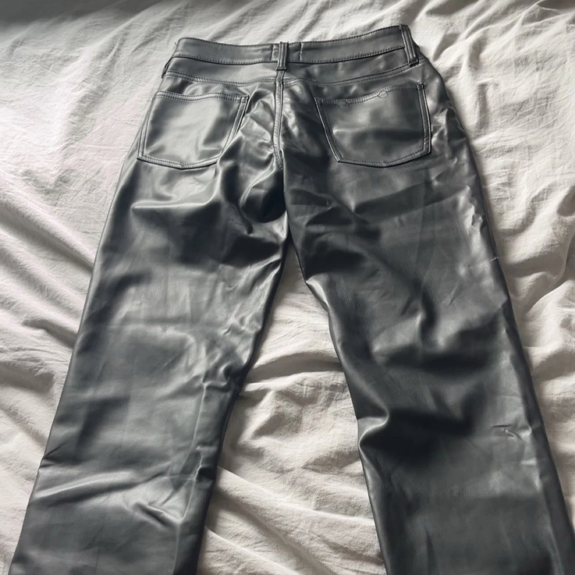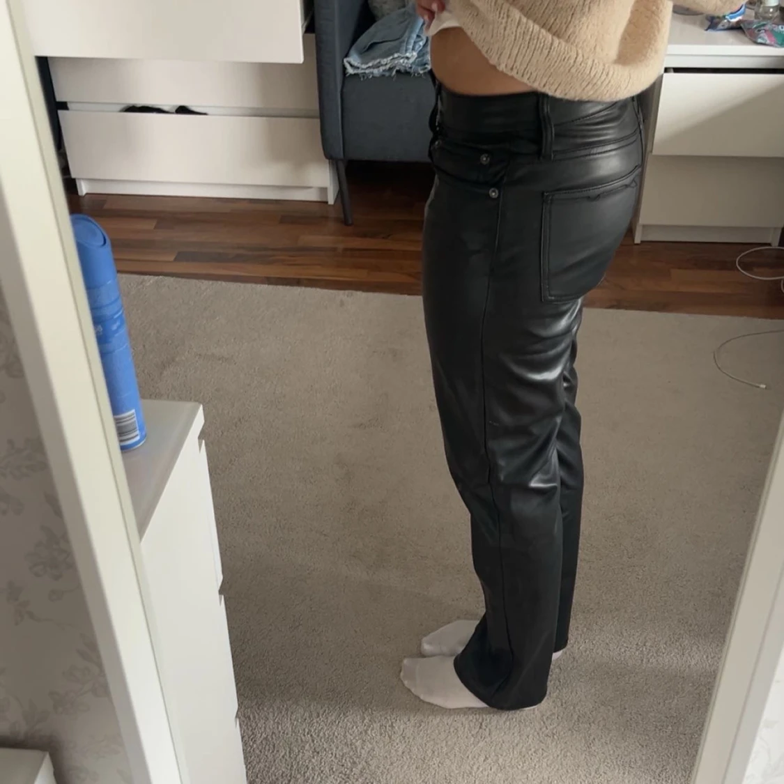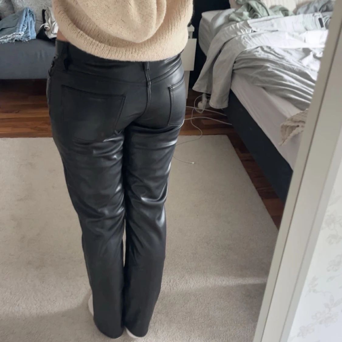 Säljer ett par svarta skinnbyxor med normal passform och raka ben. Byxorna har klassisk femficksdesign, dragkedja och knapp framtill. Snygga detaljer och stilren look som passar till många outfits.