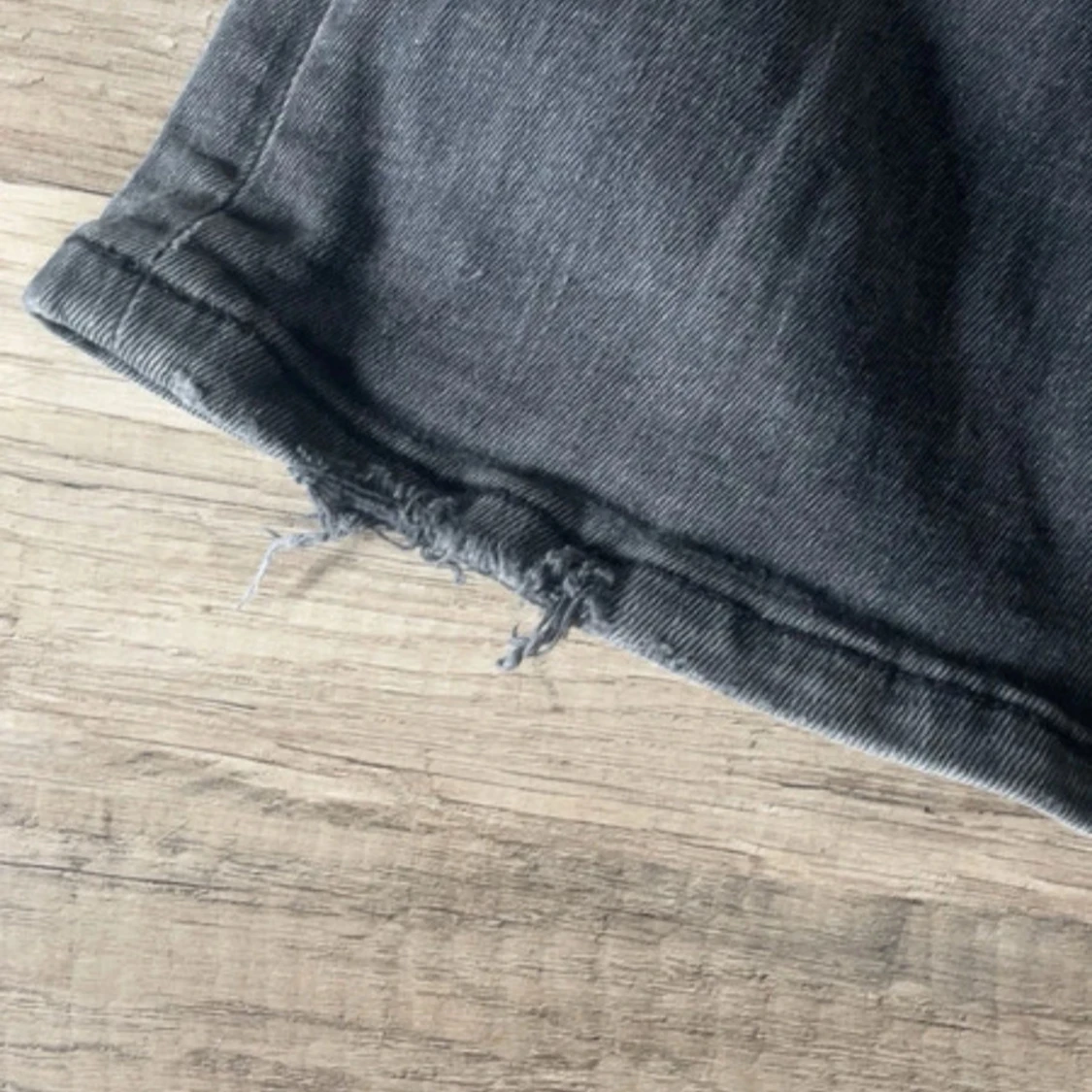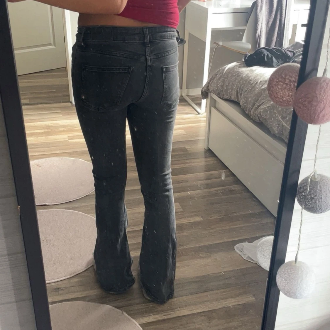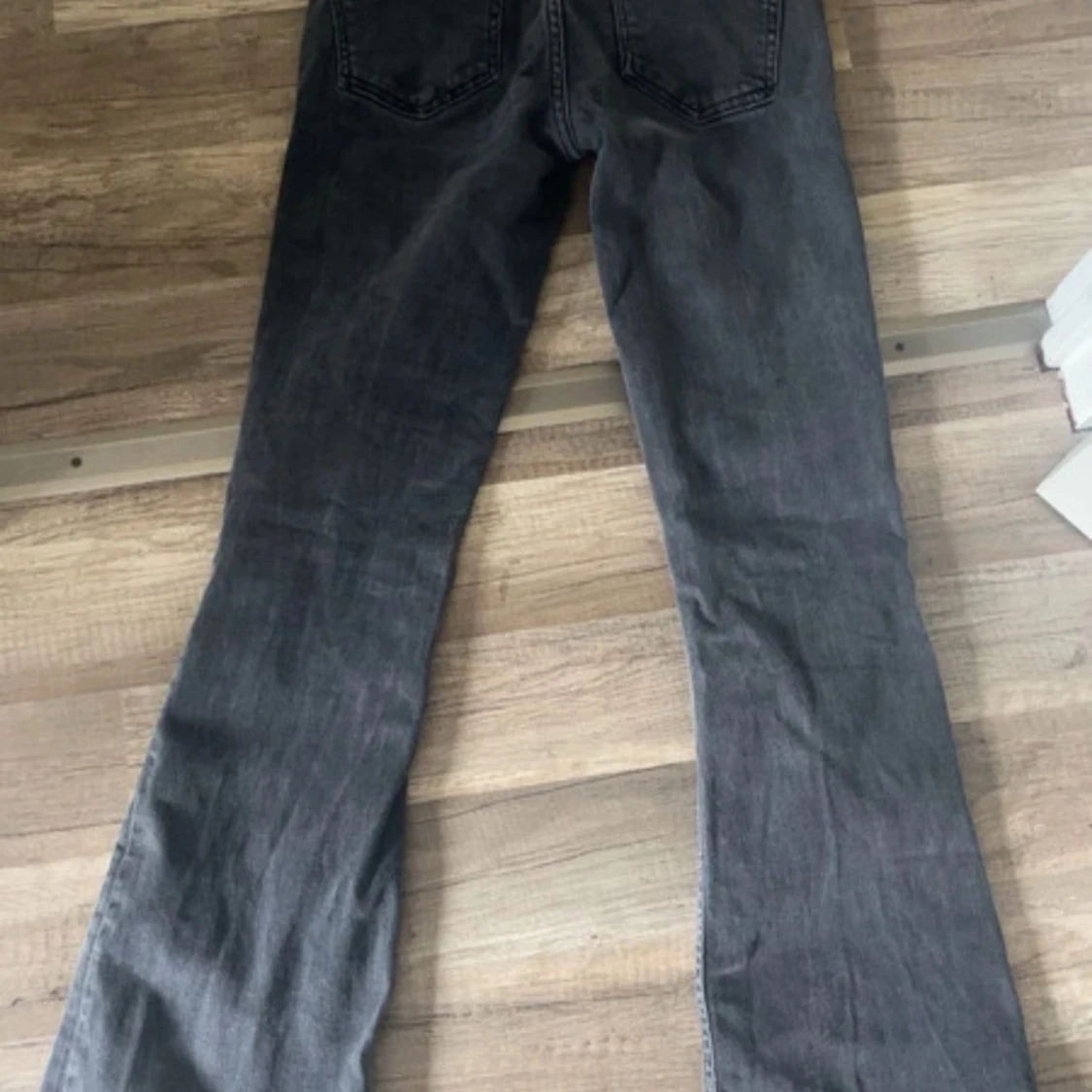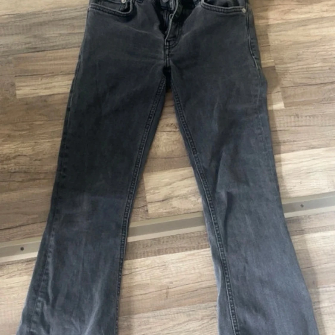 Snygga svarta jeans som blivit mer åt det mörkgråa håller. Använd några gånger därav har det blivit slitningar längst ner men inget stort. Storlek: xs short på mig som är 158cm