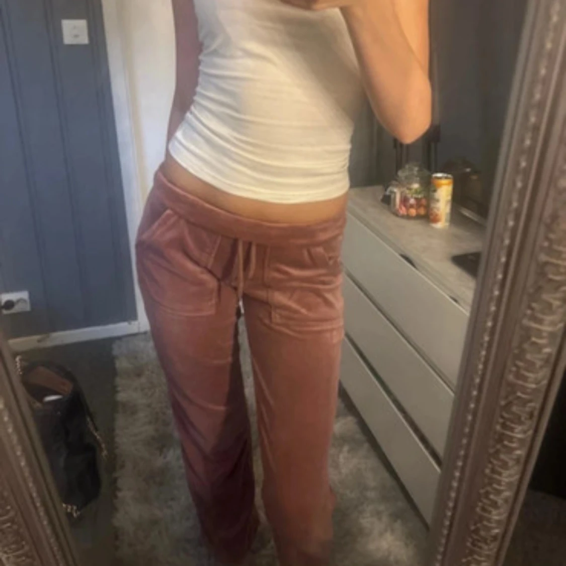 Rosa mjukisbyxor med fickor bak i velour tyg, fint skick förutom ett litet hål bak som syns på sista bilden, har även en annons på ett par liknande i svart, kan gå ner i pris vid köp av båda🩷