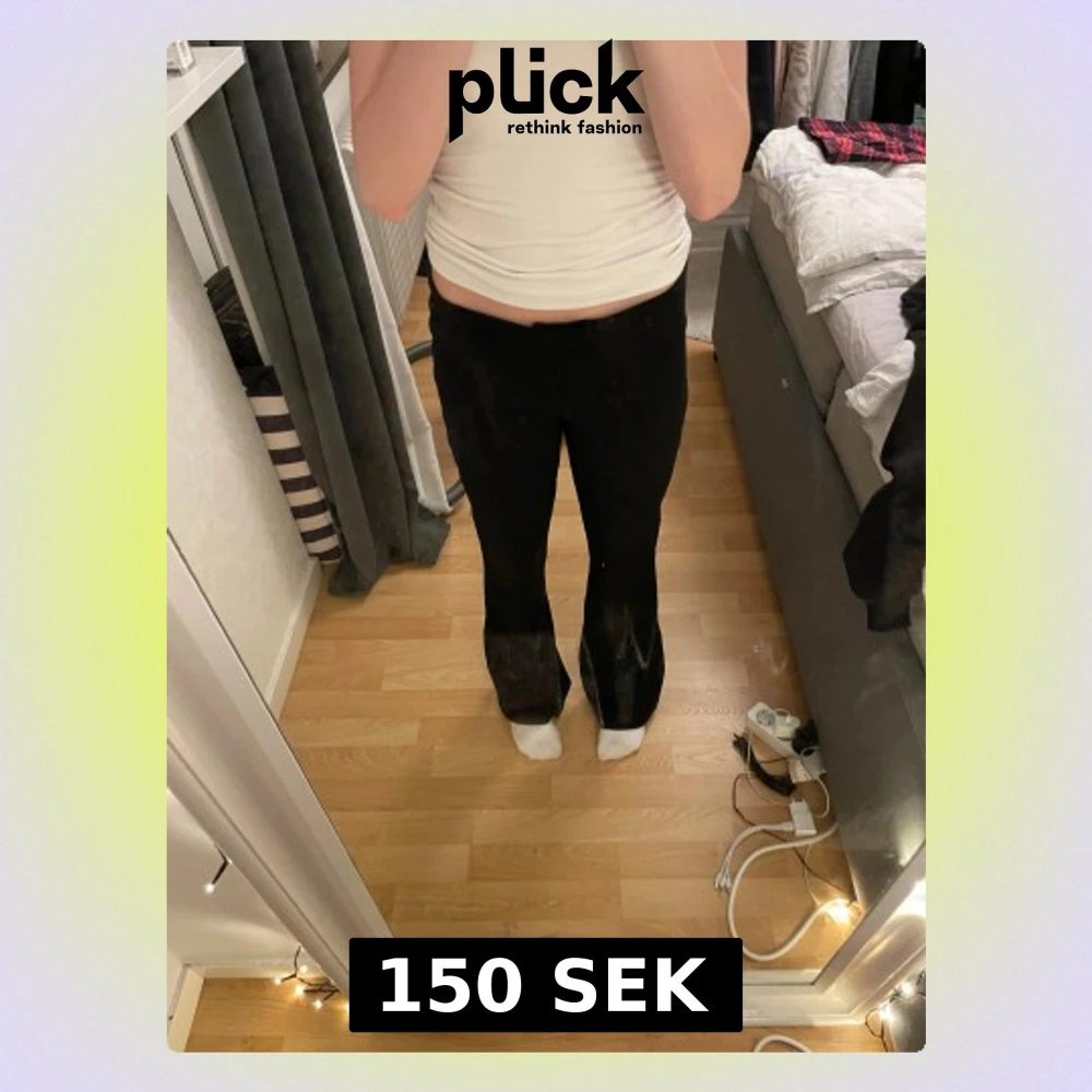 Säljer ett par svarta bootcut byxor med låg midja. De är gjorda i ett mjukt material som sitter skönt och har en snygg passform som framhäver benen. Perfekta om du gillar en stilren look med lite extra sväng i benen.