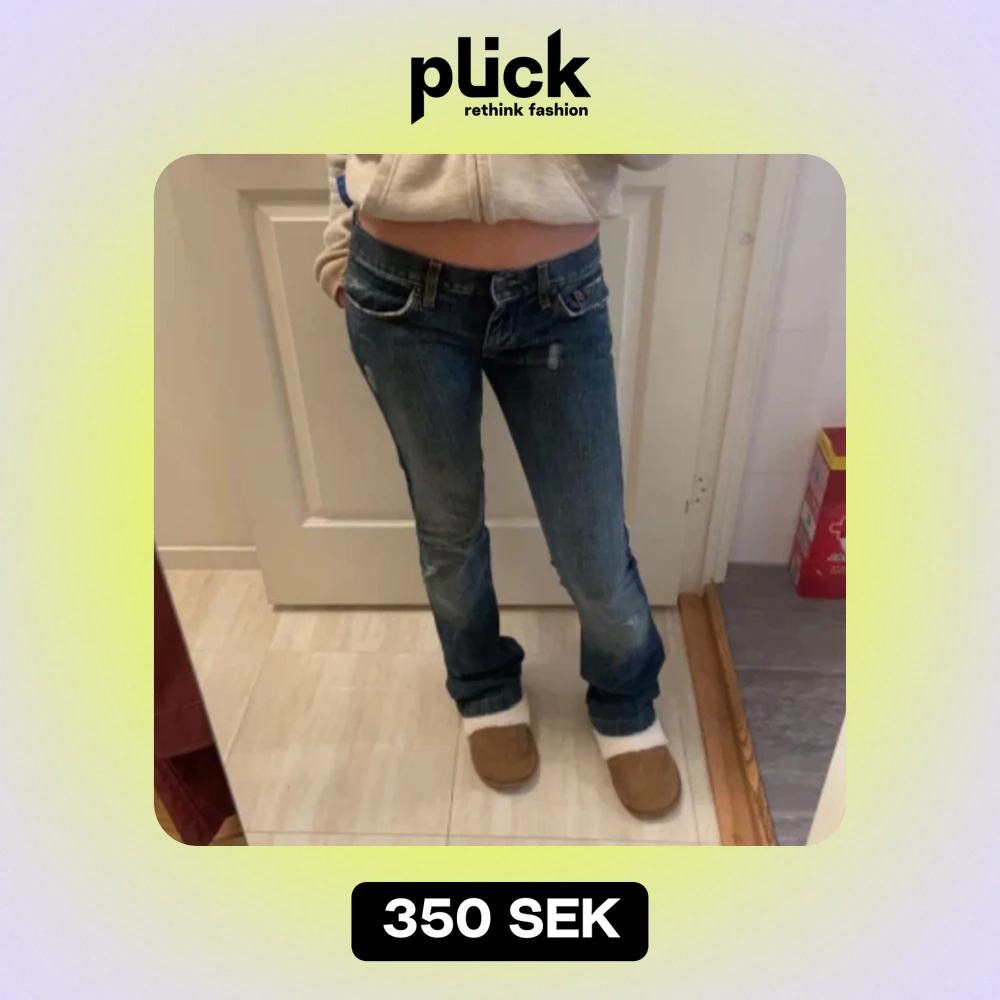 Super coola lågmidjade bootcut jeans som jag sytt om bakfickorna på med ett teddy material. Mörkblåa och så unika💗 skulle säga att de är en storlek 25/26 i midjan