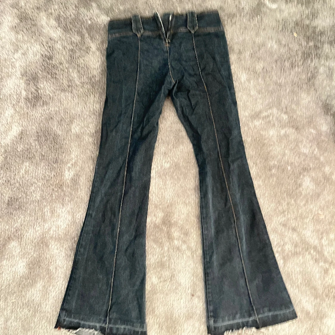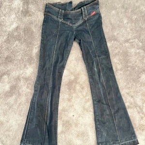 Så coola och unika jeans som tyvärr inte kommer till användning längre. De har en söm i mitten och saknar fickor, blixtlås i bak och mer utsvängda vid fötterna. Mått: 46 cm midja rakt över, 86 cm innerbenet💕 jag är 176!
