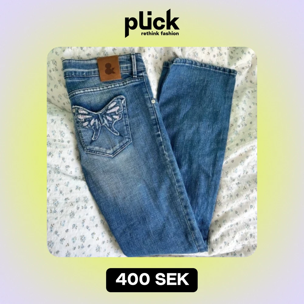 Säljer dessa jättesöta jeans med fjärilar på fickorna! Köpta här på plick och aldrig använda då de inte passar mig 💖 Midja: 38 cm Längd: 102 cm