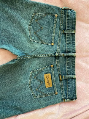Superfina Wrangler från 90-talet. Lågmidjade. Stretch. Innerbenslängd 78 cm, rakt över linningen 40 cm, alltså över höfterna.
