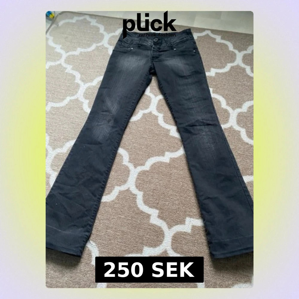 Snygga svarta jeans från WST Jeans med bootcut-modell och klassisk femficksdesign. Jeansen har en något utsvängd passform nertill, dubbla knappar i midjan och diskreta slitningar för en cool look. Perfekta för dig som gillar en tidlös stil. Storlek 34 26. Byxorna är uppvikta, men bara ca 6 cm så ifall om man skulle vilja kan man sprätta upp. Lite blå färg har också råkat stänka på byxorna men inget som märks när man kollar på dem och som går det att få bort i tvätten. Pris kan diskuteras!