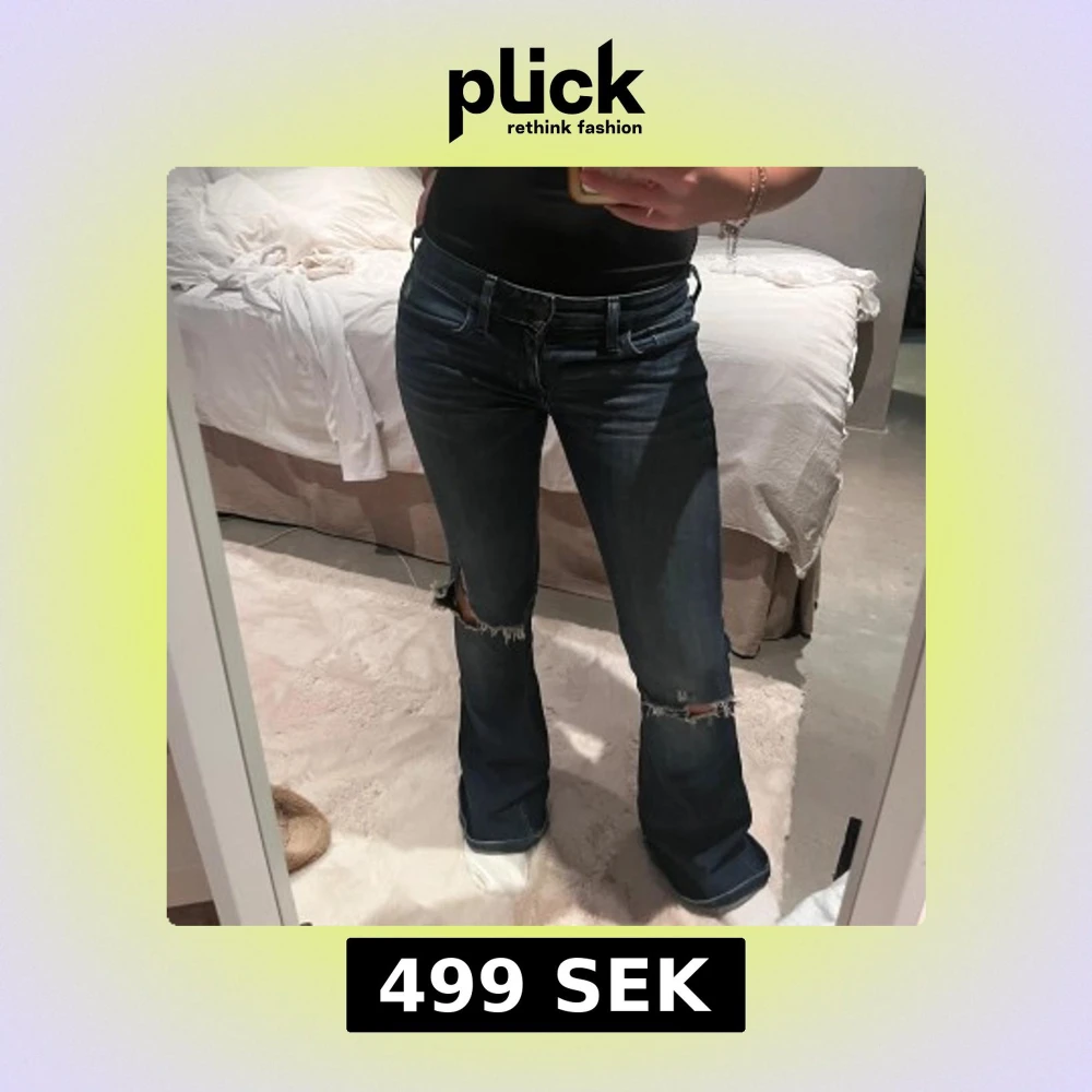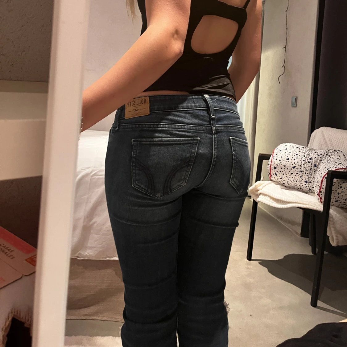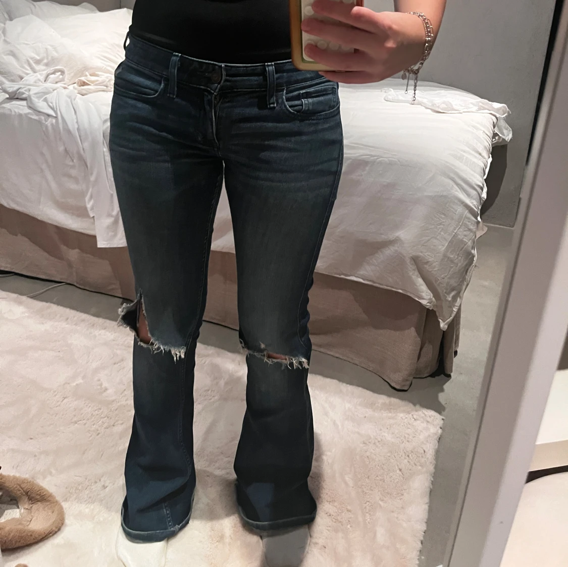 Snygga mörkblå jeans från Hollister med bootcut passform och slitna detaljer vid knäna. Klassisk femficksmodell med hög midja och tydliga sömmar. Jeansen är tillverkade i stretchigt denim för skön passform och har en cool, lite edgy vibe.