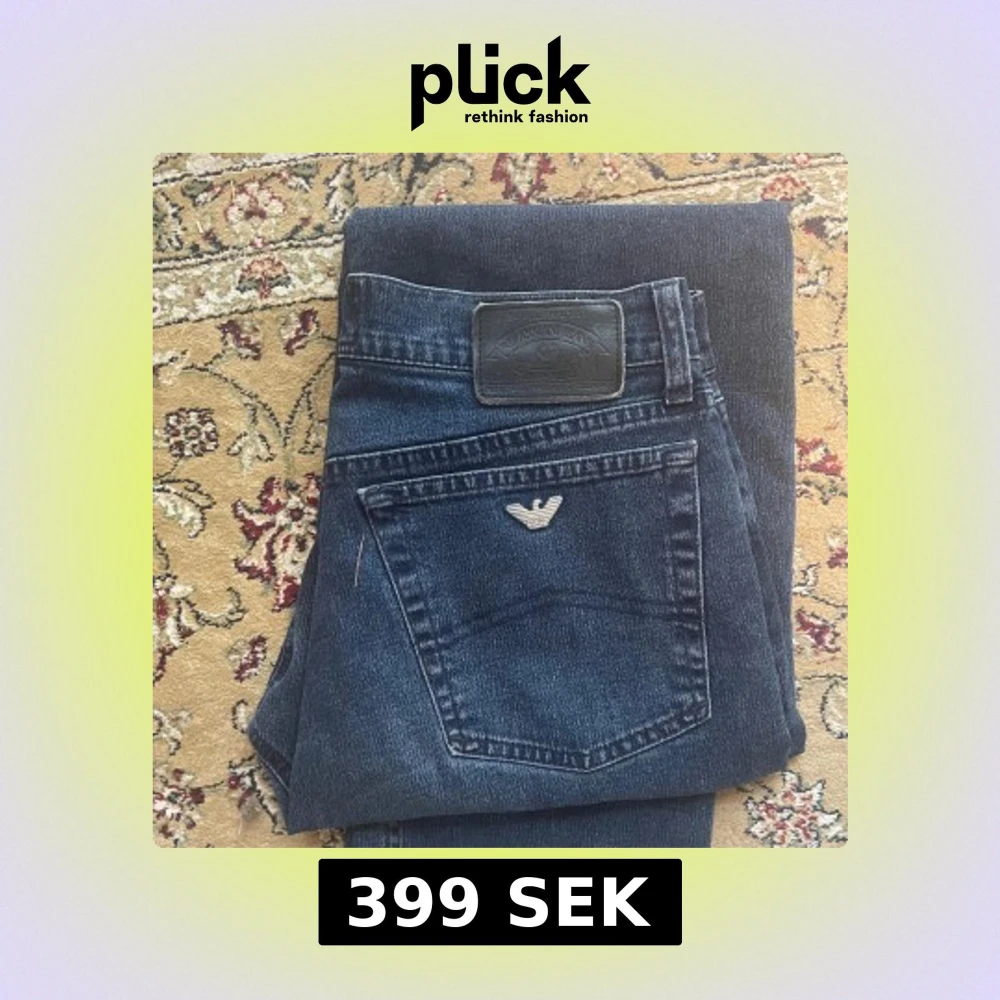 Säljer ett par mörkblå jeansbyxor från Armani med klassisk femficksdesign och silverfärgad logga på bakfickan. Jeansen har normal passform och raka ben. Perfekta för dig som gillar stilrena och tidlösa jeans.