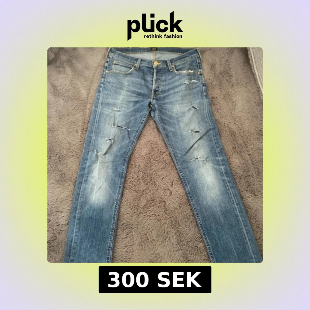 Säljer ett par blå jeans från Lee med slitna detaljer och smal passform. Jeansen har klassisk femficksdesign, dragkedja och knapp framtill samt Lee-lapp bak i midjan. Perfekta för en avslappnad och trendig look.