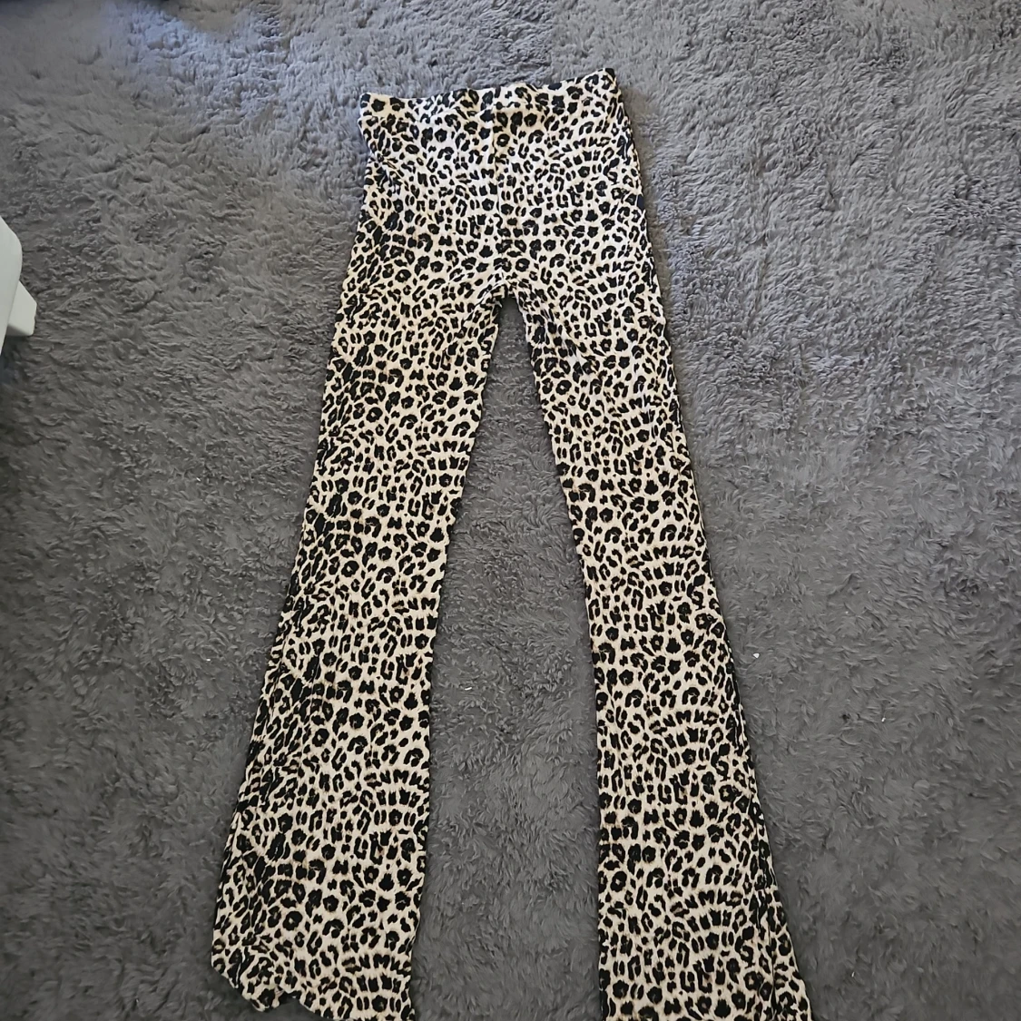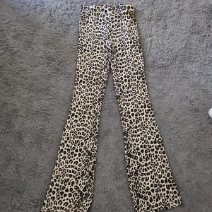 Säljer ett par snygga bootcut byxor med leopardmönster. Byxorna har en beige bas med svarta och bruna fläckar, vilket ger en riktigt cool look. De är utsvängda nertill och har en figurnära passform upptill. Perfekta för dig som vill sticka ut.