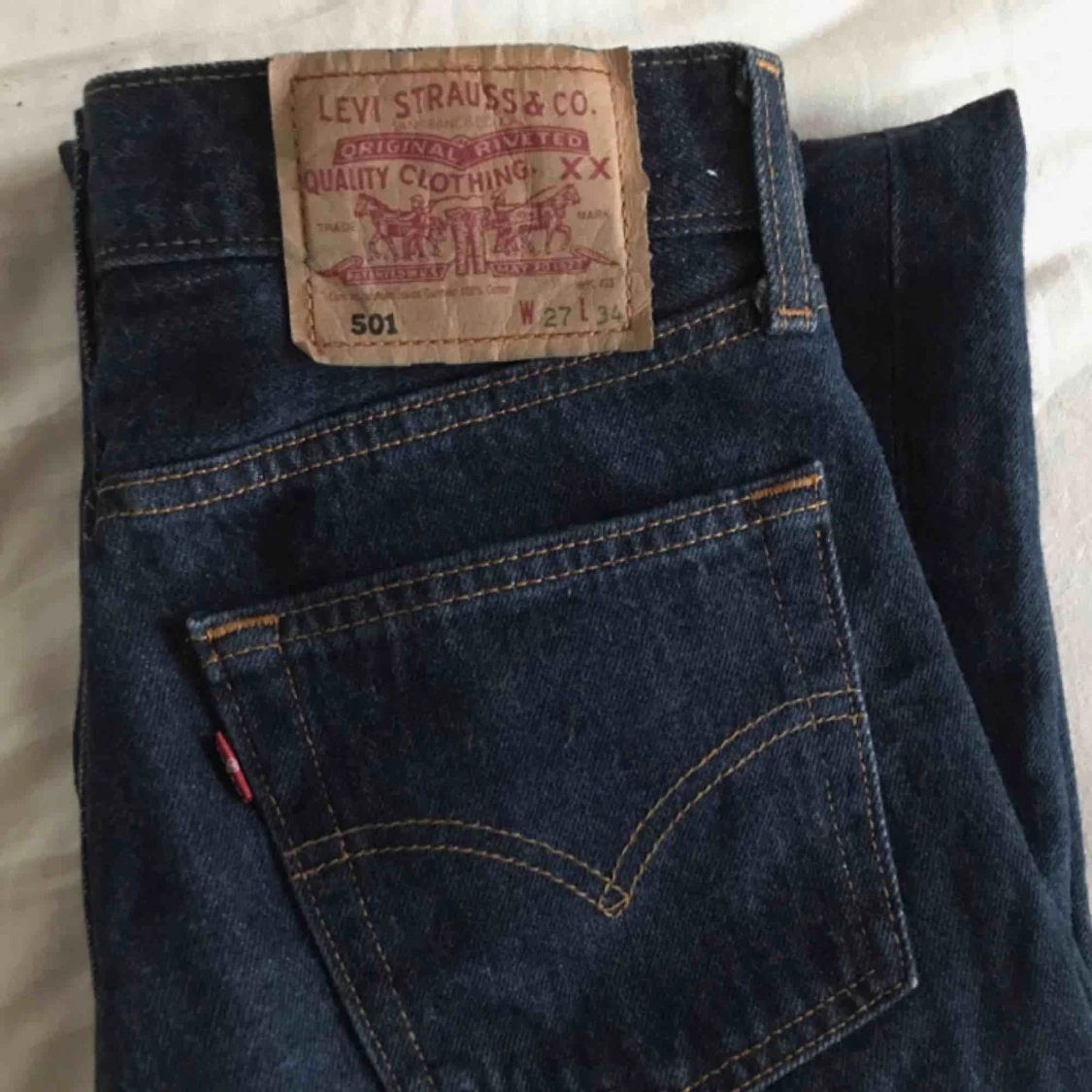 Levi’s 501 i mörkblå färg. Har klippt dem själv och på mig som är 169cm går de precis till fotlederna. Fint skick! Köparen står för frakt ⭐️