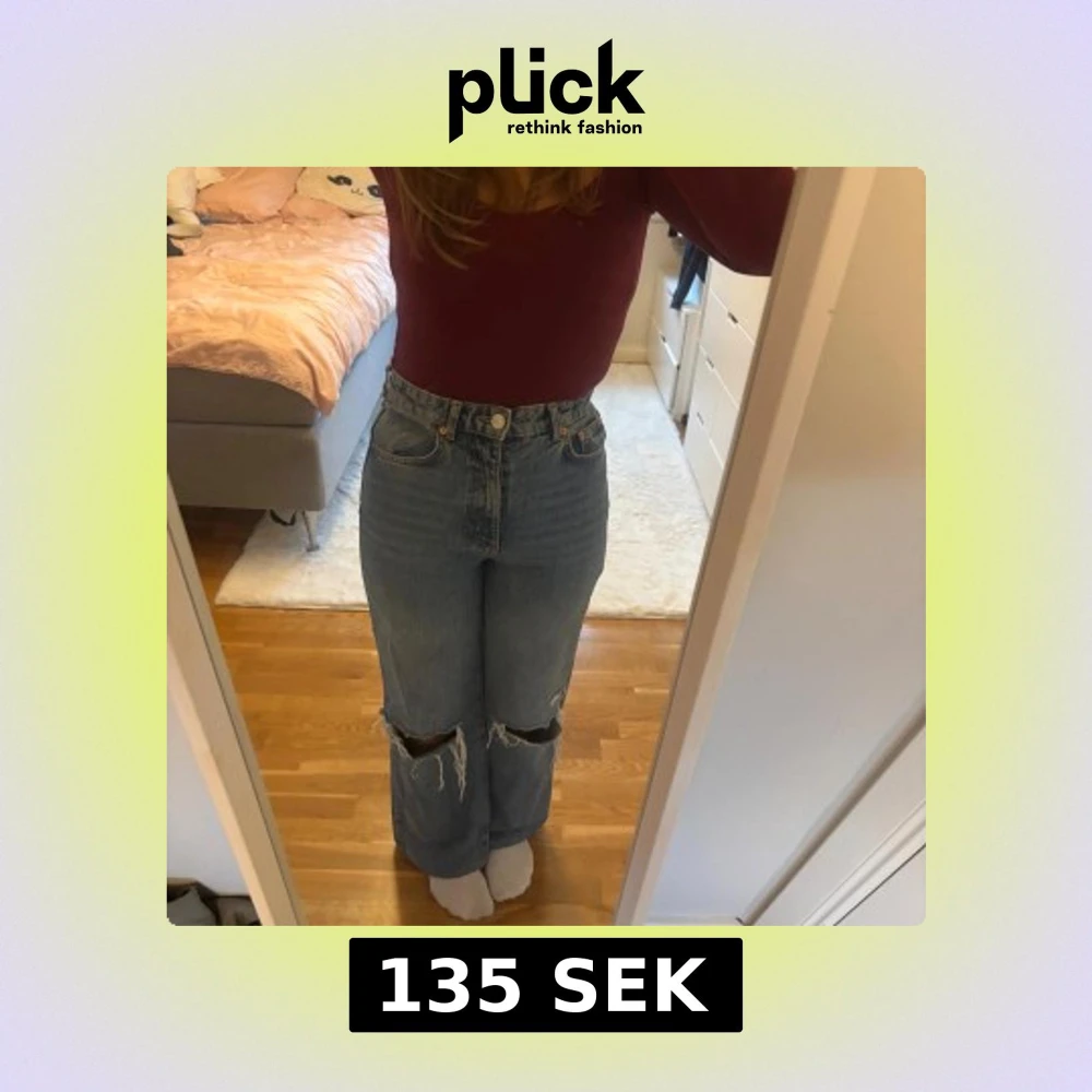 Säljer ett par klassiska high waist jeans i blå denim med hög midja och raka ben. Jeansen har stora slitna hål vid båda knäna för en cool, avslappnad vibe. Materialet är robust och passformen är loose och straight. Från Gina tricot. Som nyskick. Nypris 699 kr