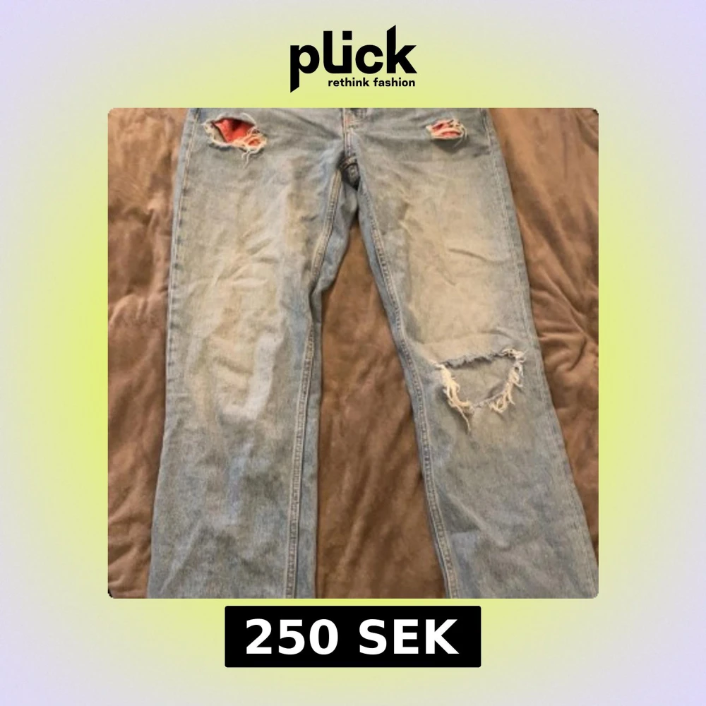 Ljusblå jeans med snygga slitningar och hål på båda benen för en cool och avslappnad look. Klassisk femficksmodell med raka ben och normal passform. Perfekt för dig som gillar streetstyle och vintage vibe. Pris kan diskuteras och köparen står för frakt (den har en liten fläck på benet på andra bilden som jag inte vet om den försvinner i tvätten eller inte)