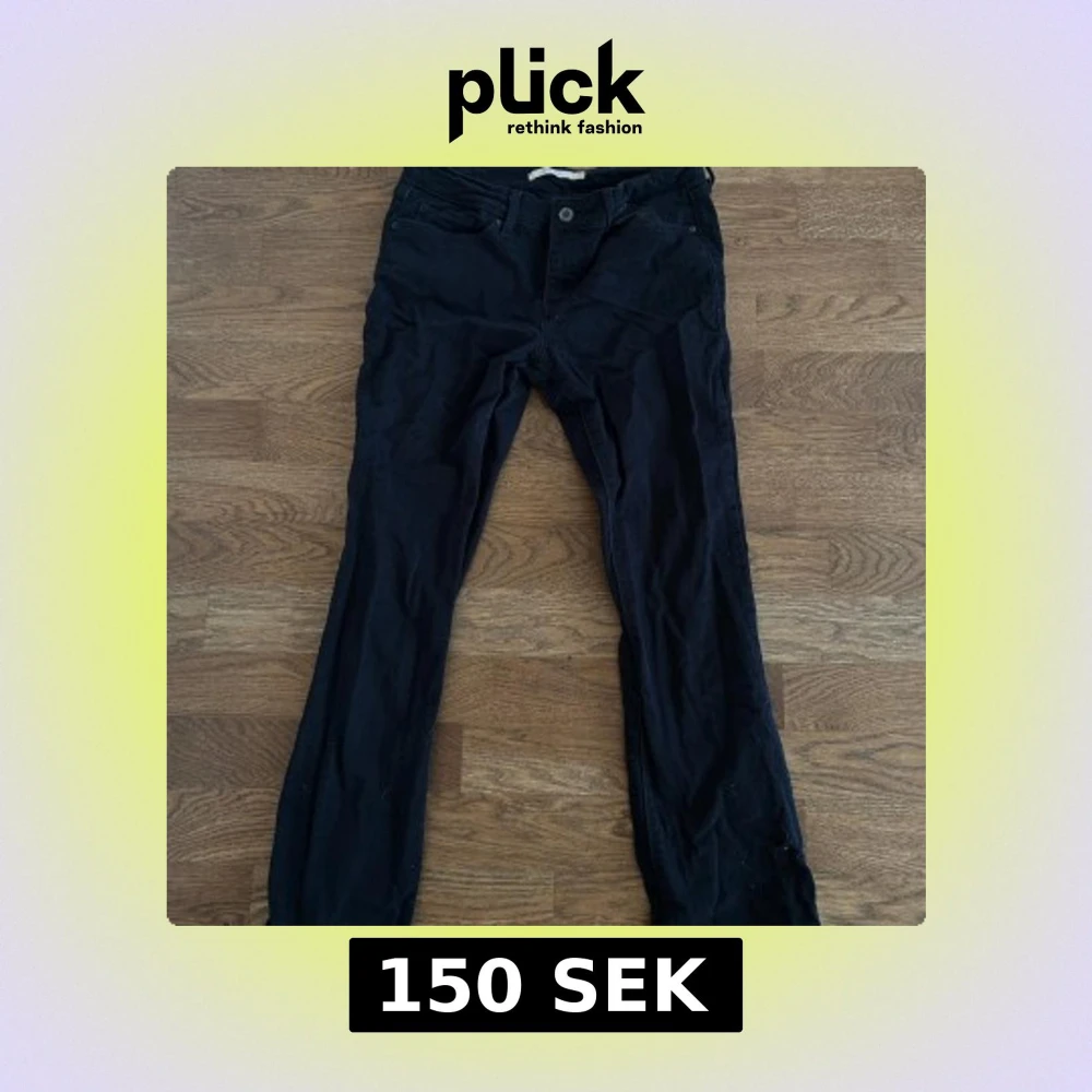 Snygga svarta bootcut jeans med klassisk design. De har en knapp och dragkedja framtill samt fickor både fram och bak. Perfekta för en stilren look. Lite skrynkliga då dom nyss kom ut från tvätten
