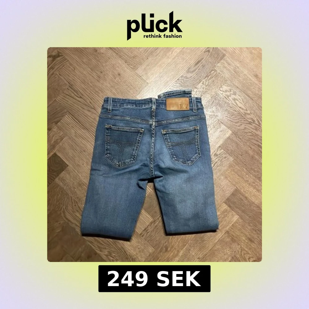 Säljer ett par blå skinny jeans från tiger of sweden med klassisk femficksdesign och brunt läderpatch bak i midjan. Jeansen har smal passform, dragkedja och knapp framtill samt snygga slitningar för en cool look. Perfekt för dig som gillar stilrena och tidlösa jeans. Nypris ca 2000
