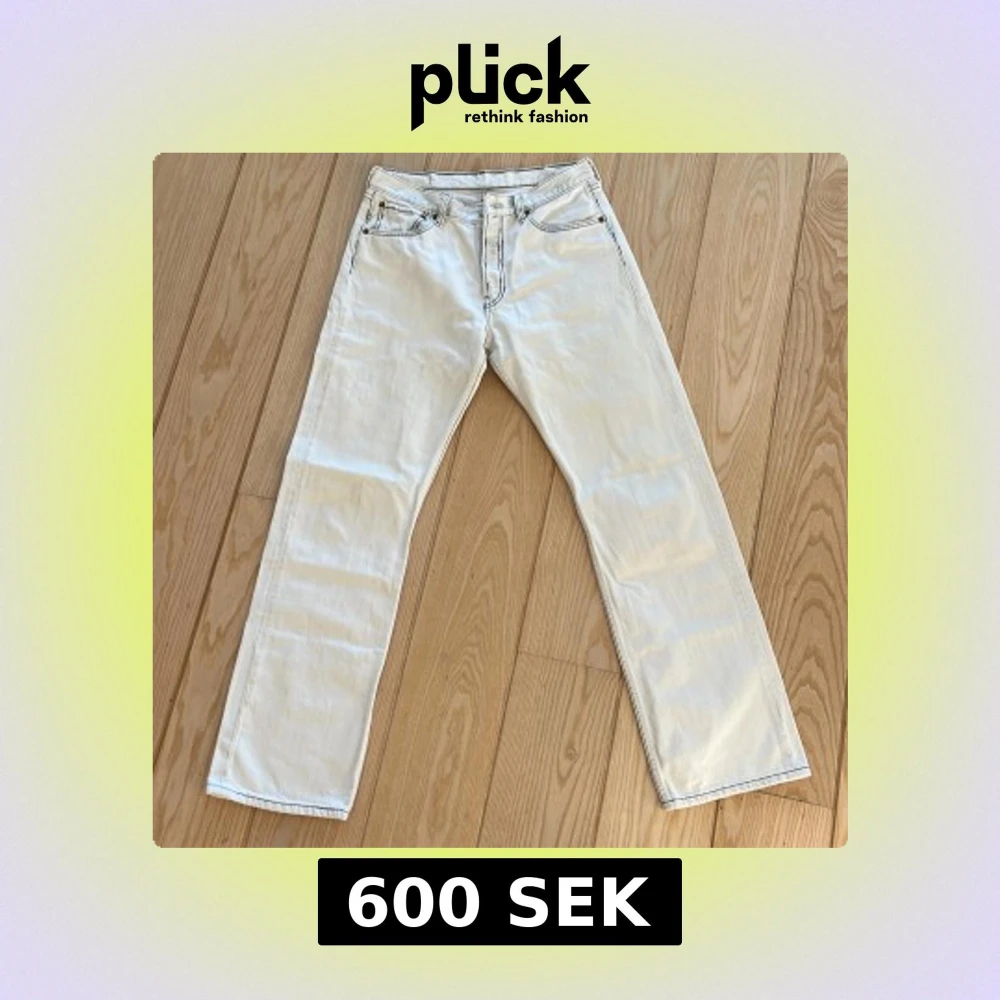Säljer ett par klassiska vita Levi's 501 jeans med raka ben och femficksmodell. Jeansen har tydliga kontrastsömmar och den ikoniska läderpatchen bak i midjan. Perfekta för dig som vill ha en clean och tidlös look.