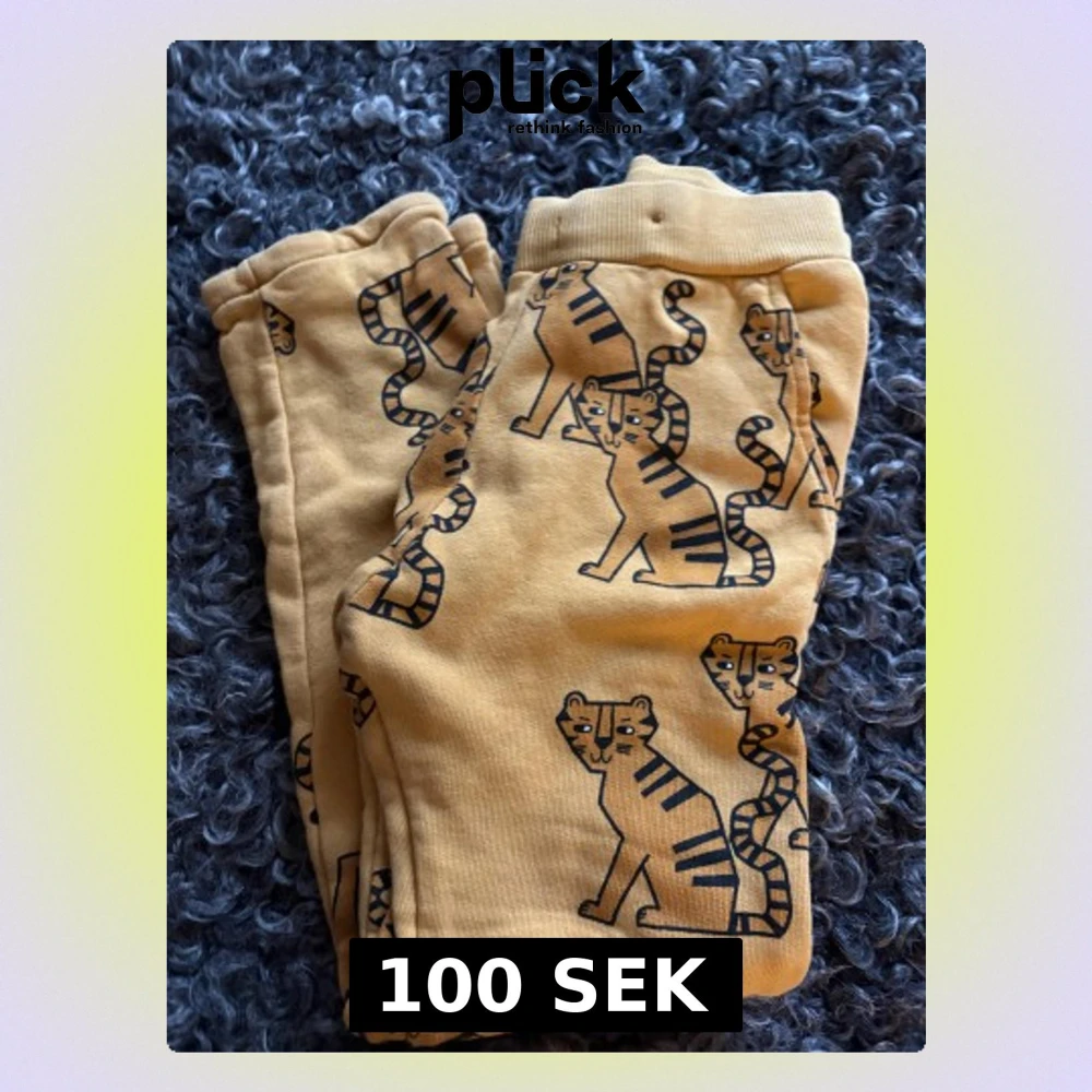 Säljer ett par mjukisbyxor från Lindex i storlek 122. Byxorna är senapsgula med coolt tigerprint över hela och har ribbad midja. Sköna och mjuka, perfekta för chill dagar. Materialet är bomull och de har normal passform.