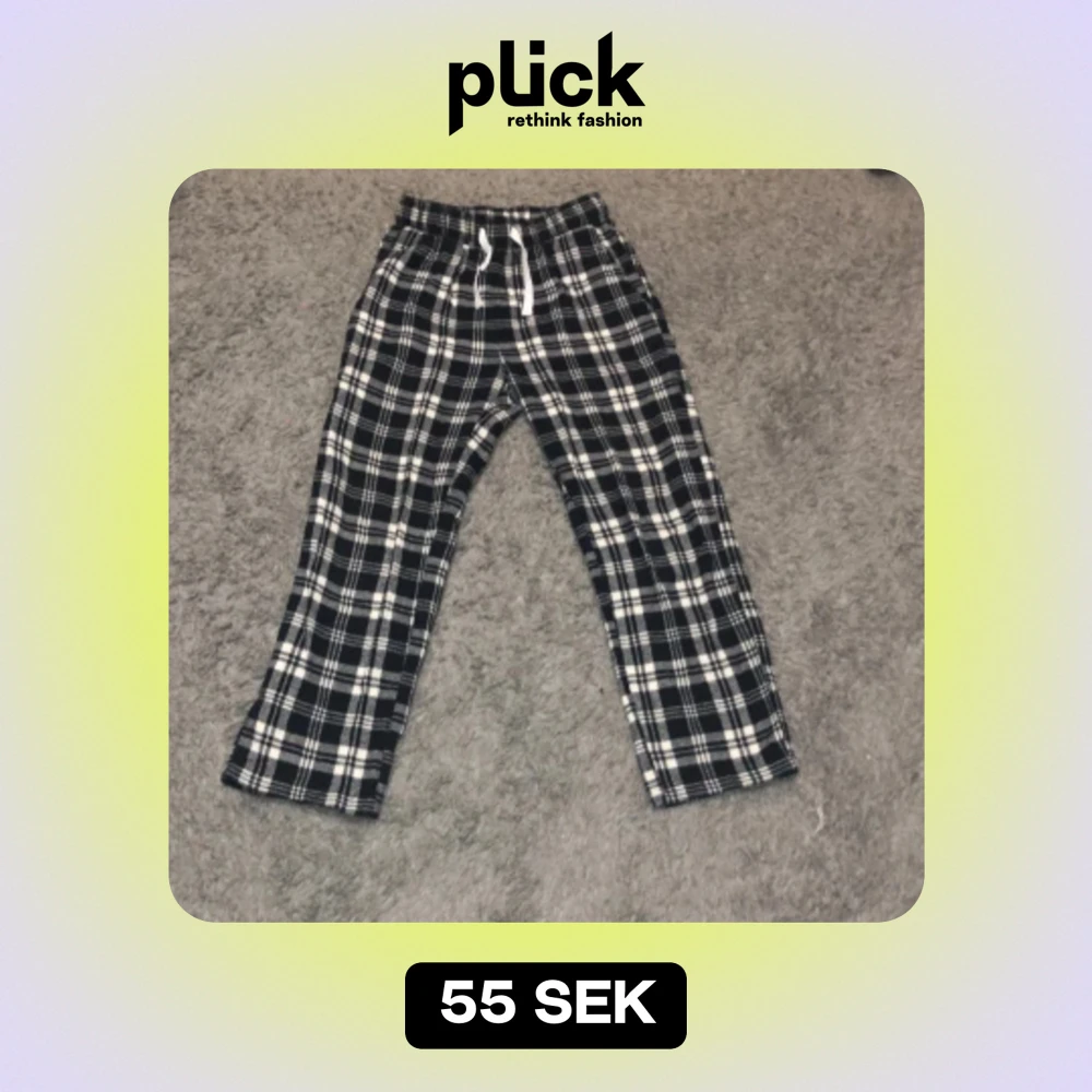 Byxorna är mörkblå svart och vitt. Dom är rutiga.