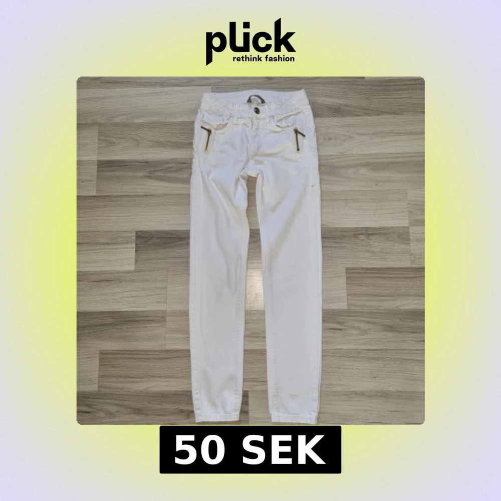 Snygga vita jeansbyxor från Lindex Kids i storlek 140. Byxorna har guldiga dragkedjor framtill, klassisk femficksdesign och knapp i midjan. Perfekt för dig som gillar stilrena och fräscha plagg med coola detaljer.
