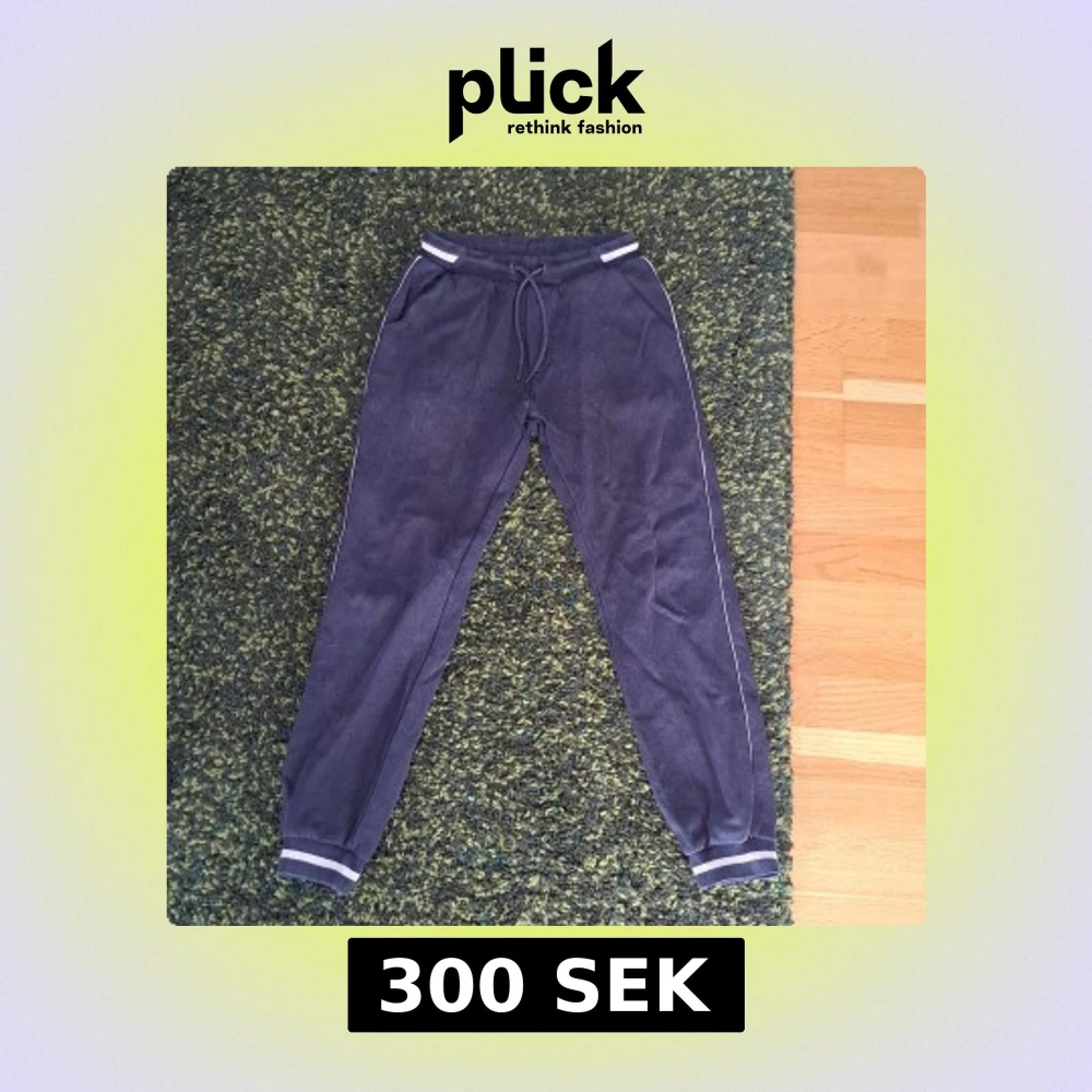 Mörkblå mjukisbyxor från Lindex med vita ränder vid midja och benslut. Byxorna har dragsko i midjan och ribbade muddar. Perfekta för chill eller träning, med skön passform och mjukt material.