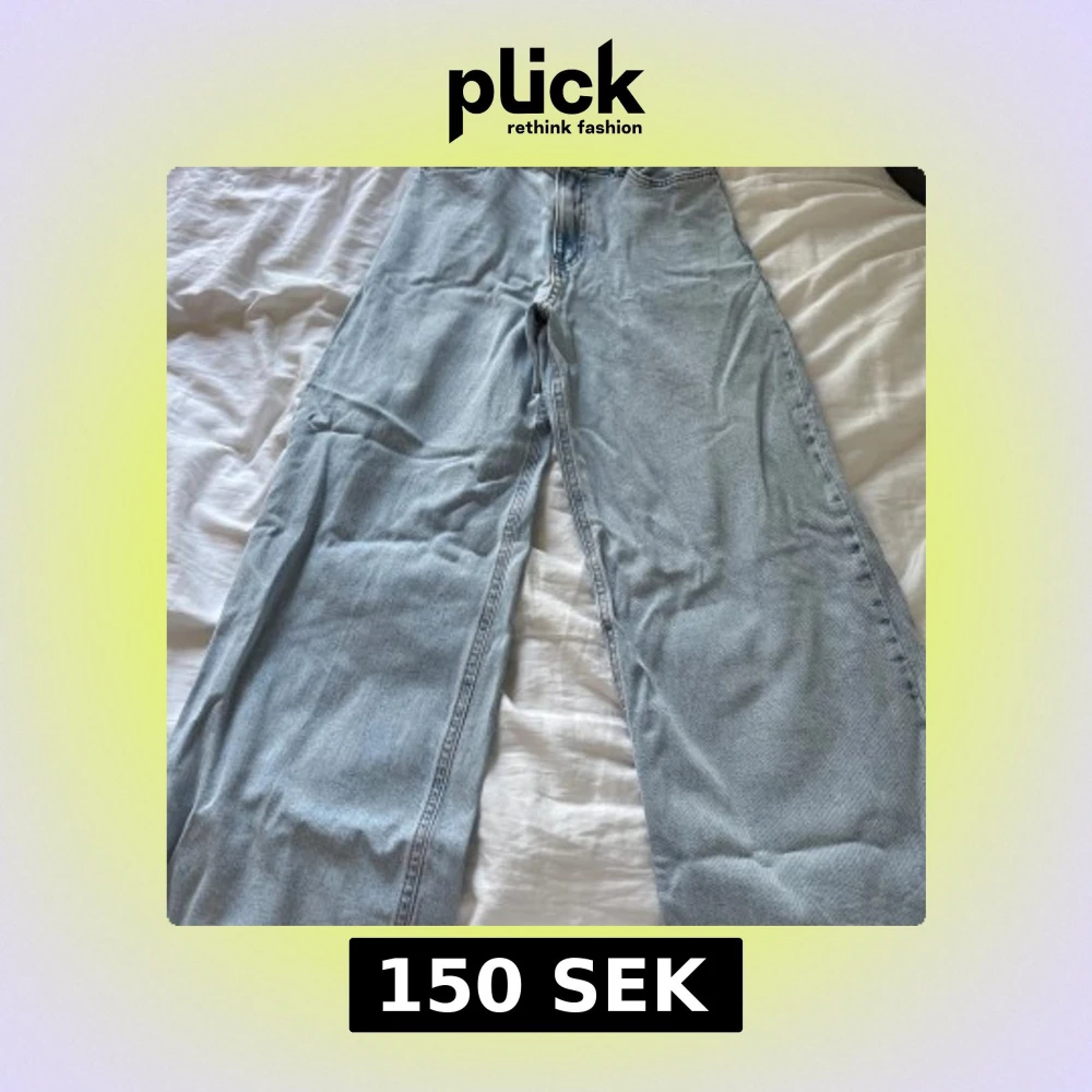 Säljer ett par ljusblå jeans från Lindex i modell med breda ben. Klassisk femficksdesign och normalhög midja. Jeansen är i mjukt denimtyg och har en avslappnad, trendig passform som är perfekt till sneakers eller boots.