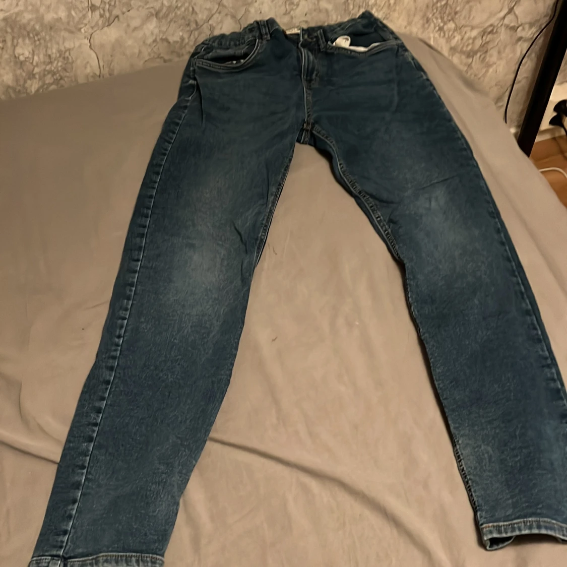 Snygga blå jeans från Lindex i storlek 164. Klassisk femficksmodell med normal passform och raka ben. Jeansen har en lätt tvättad look och är tillverkade i mjukt bomullsmaterial. Perfekta för en avslappnad stil.