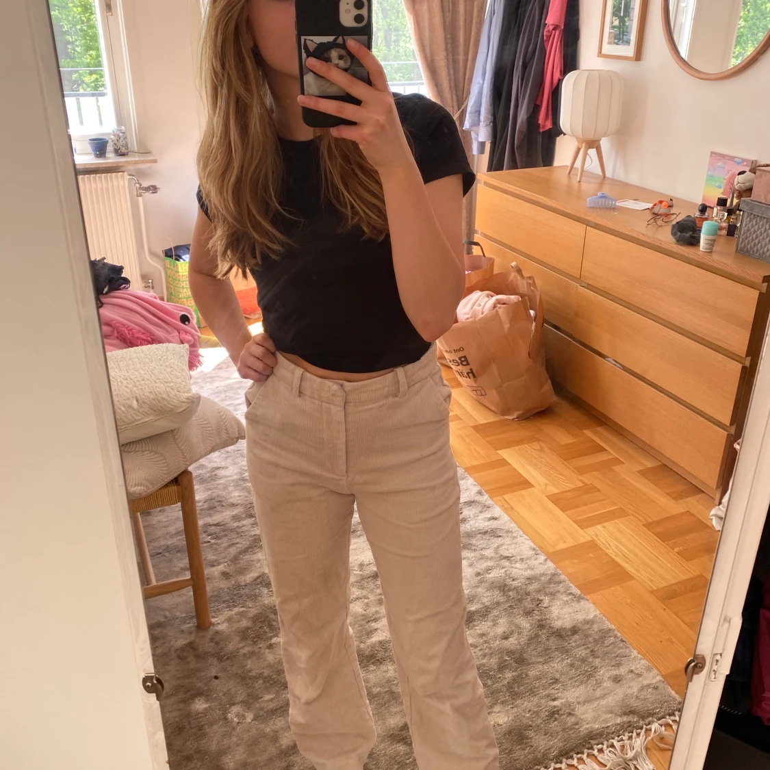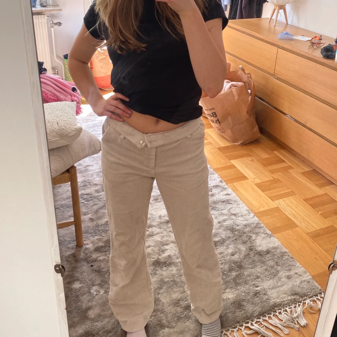 Beige byxa i Manchester tyg❤️ modellen är XS/S och är 158🤍 man kan ha dem både nervikta eller vanligt💓