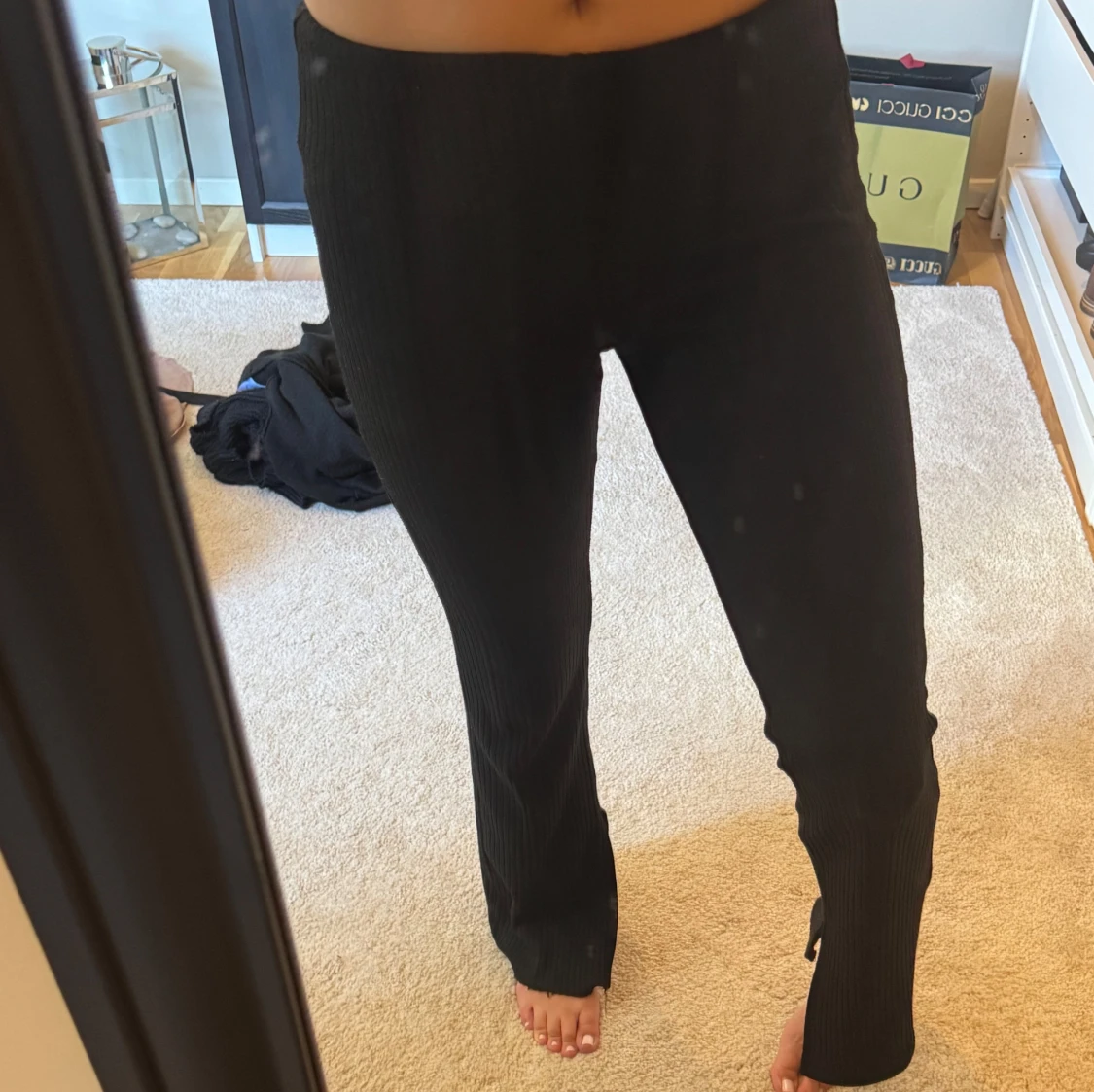 Säljer ett par svarta ribbade mjukis byxor med slits nertill. Har likadana byxor i både S och XS och säljer båda. (På bilden har jag XS) dom är väldigt stretchiga så passar nästan alla kroppsformer