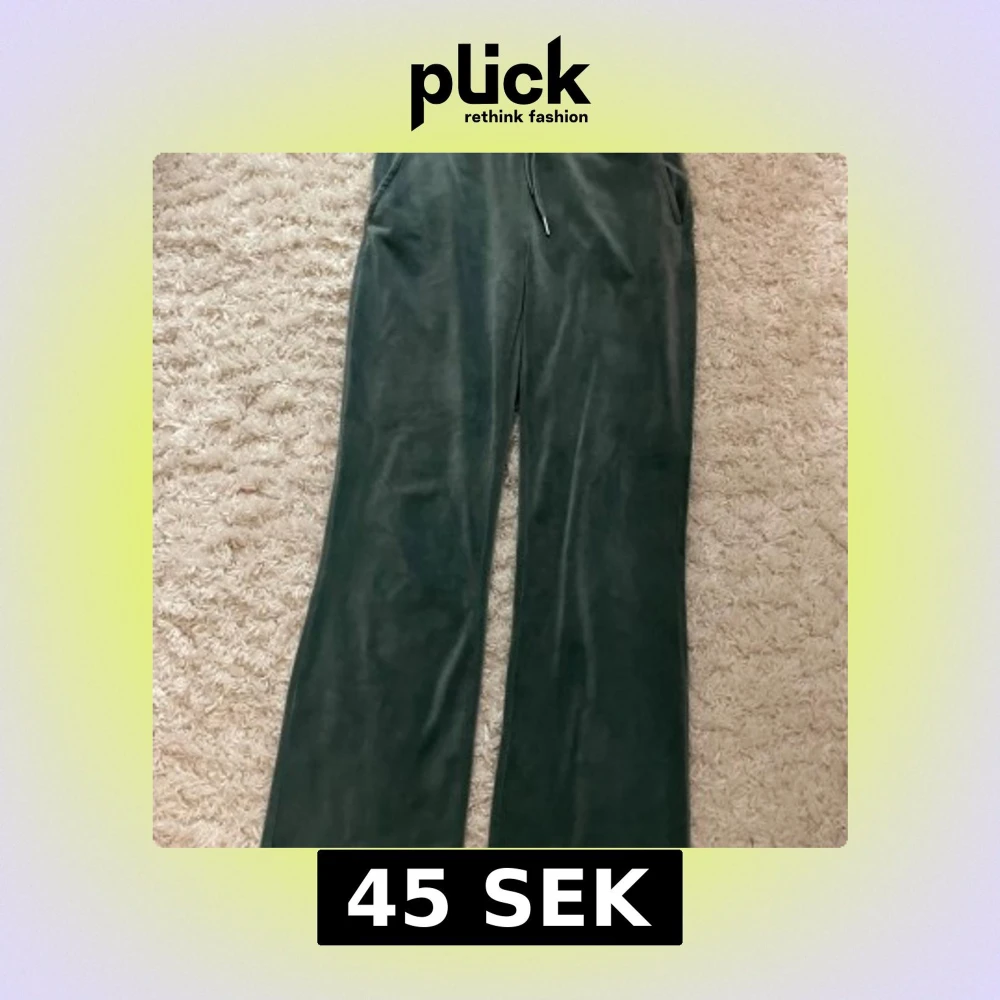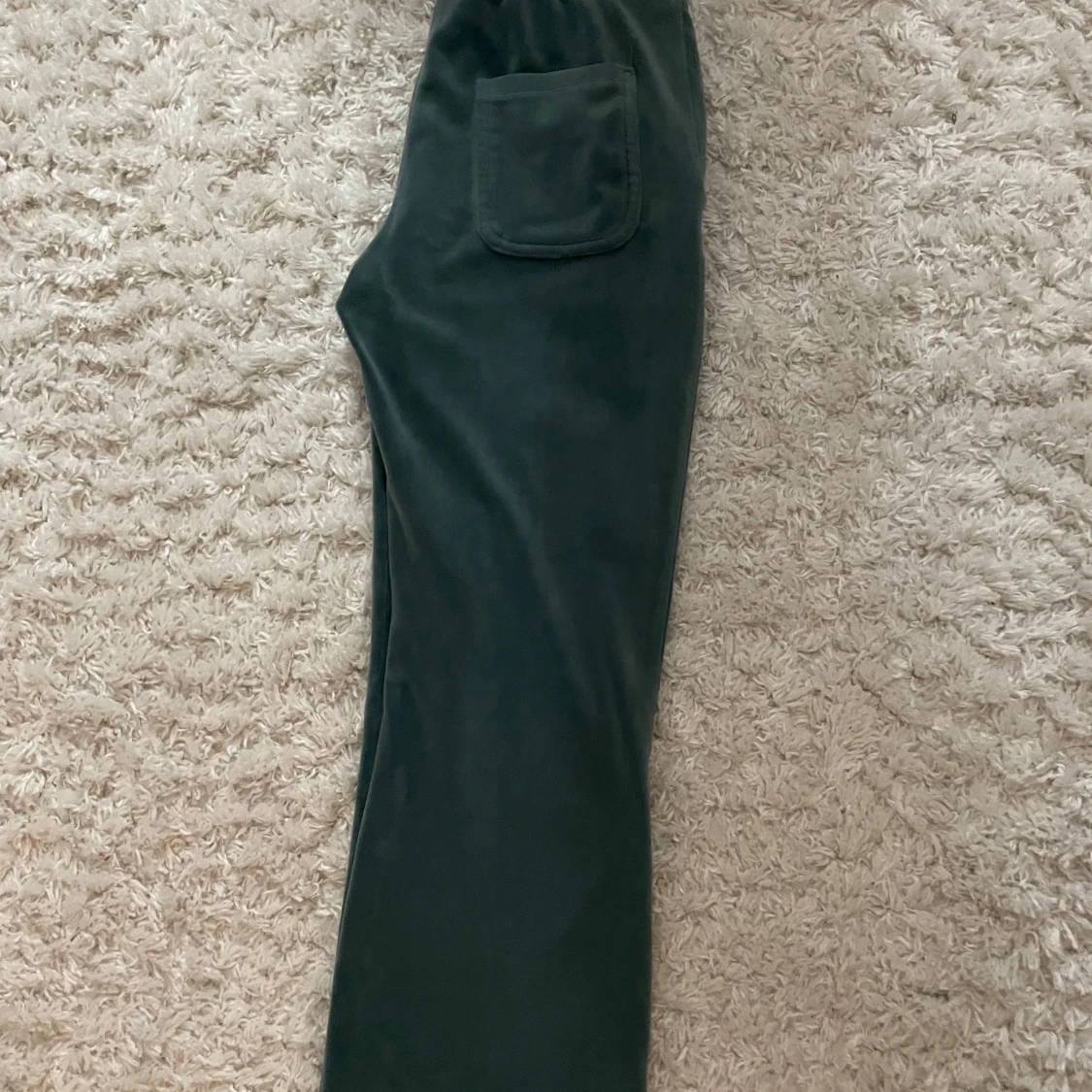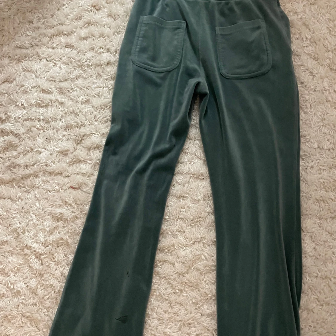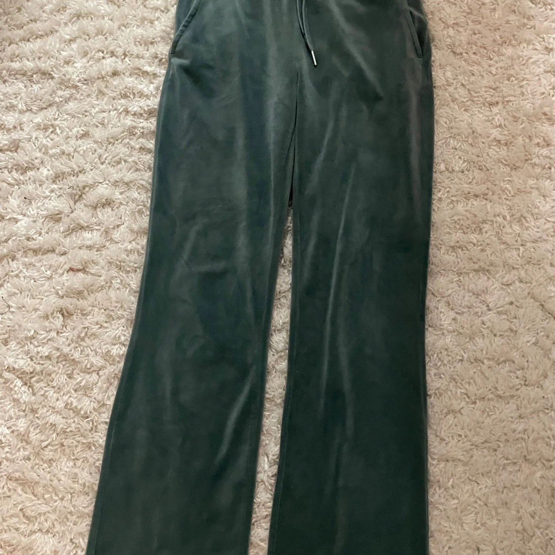 Mörkgröna mjukisbyxor i mjuk sammet med raka ben och dragsko i midjan. Byxorna har två fickor fram och två bakfickor. Perfekta för chill dagar eller när du vill vara extra bekväm. Har en liten fläck på ens benet