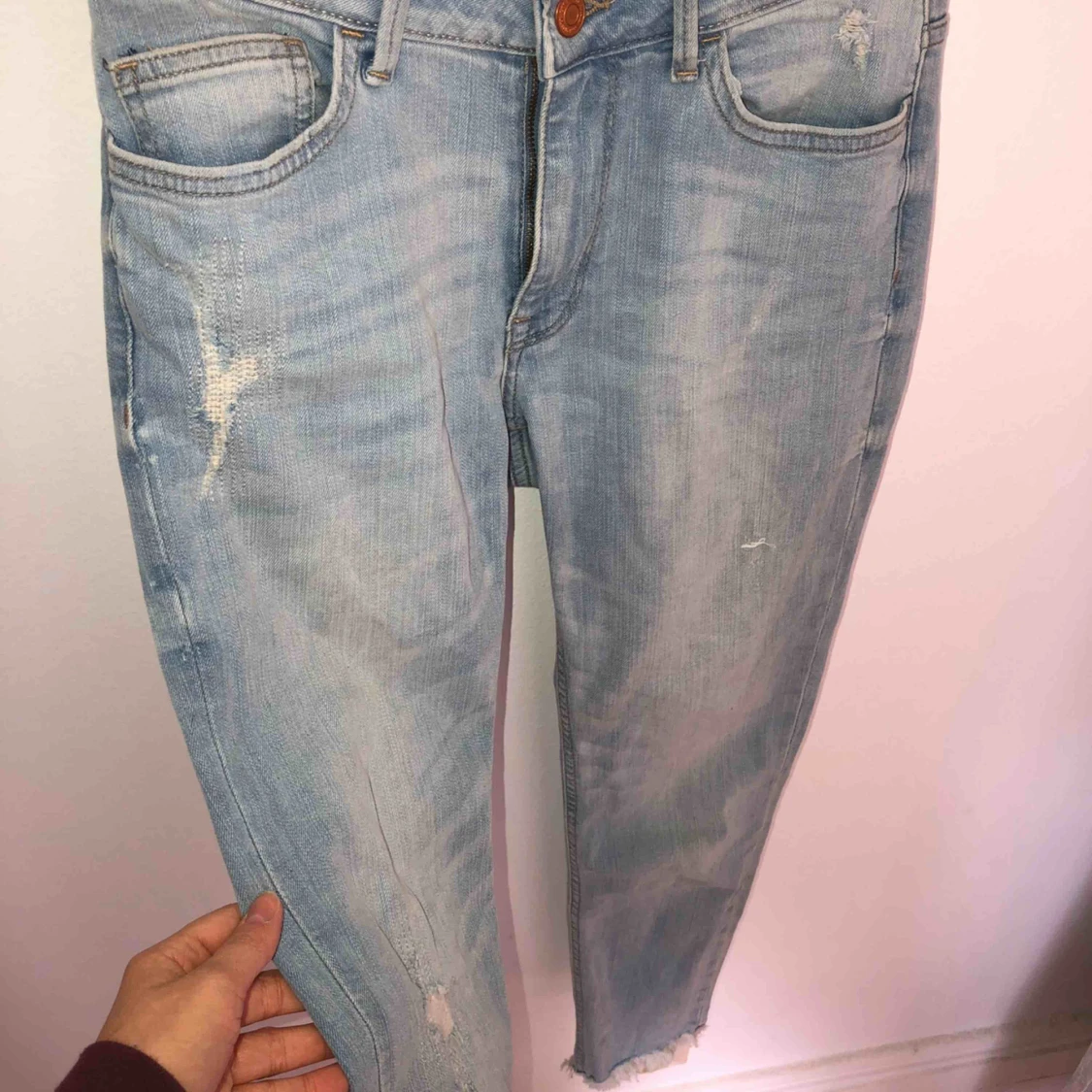 Ljusblåa lågmidjade Jeans - Säljer nu dessa sjukt fina jeansen💕jag har sytt in dem lite i benen med det tänker man inte på, skriv om du har några frågor💕