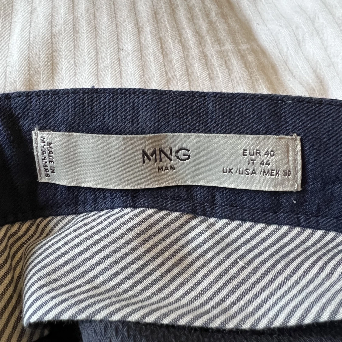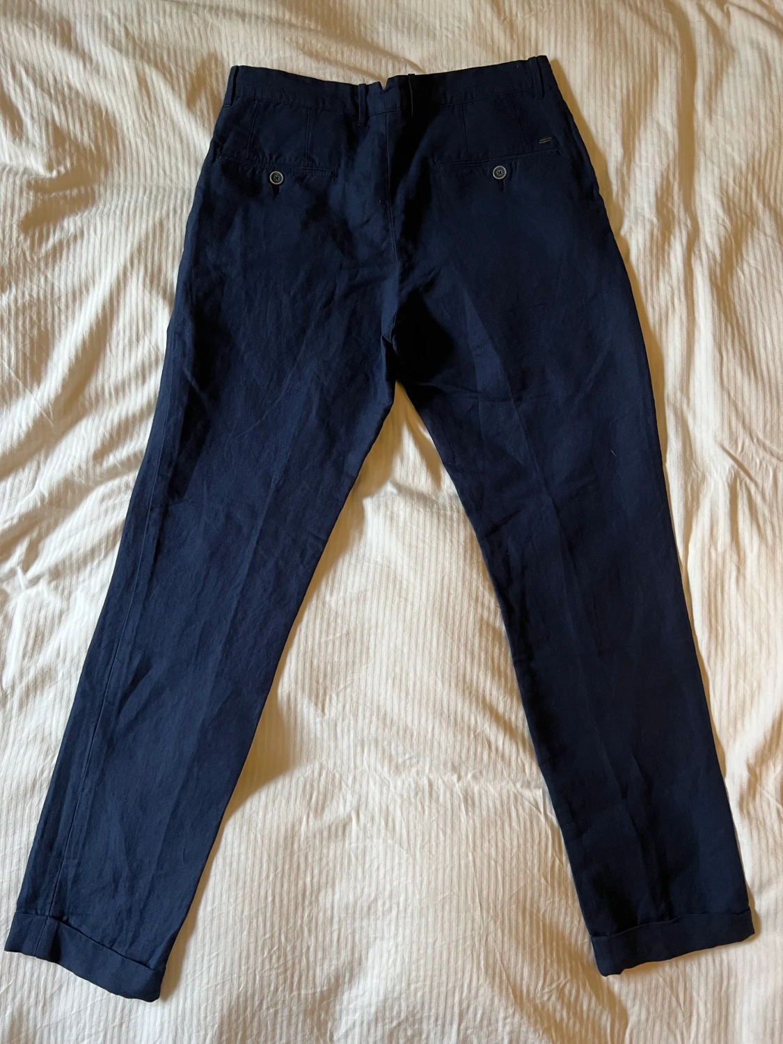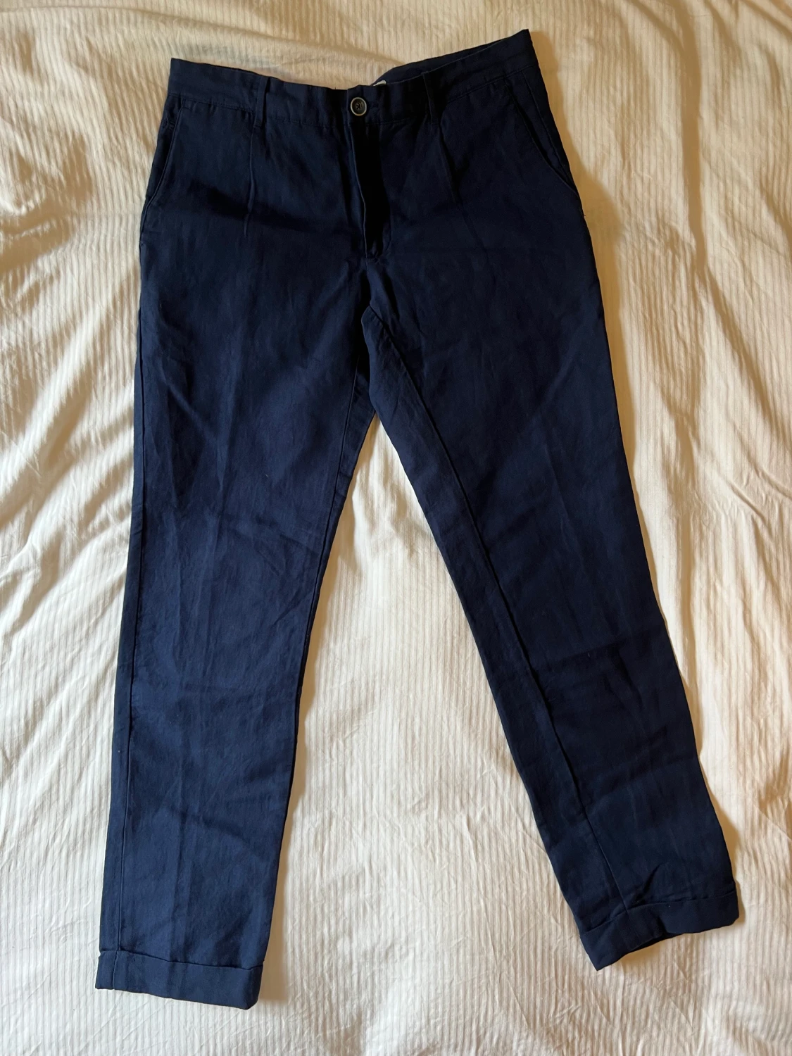 Byxor i linne/bomull-blandning marinblått, nyskick. Strl 40 motsvarande 29/30 i jeans. Sytt slag nedtill.