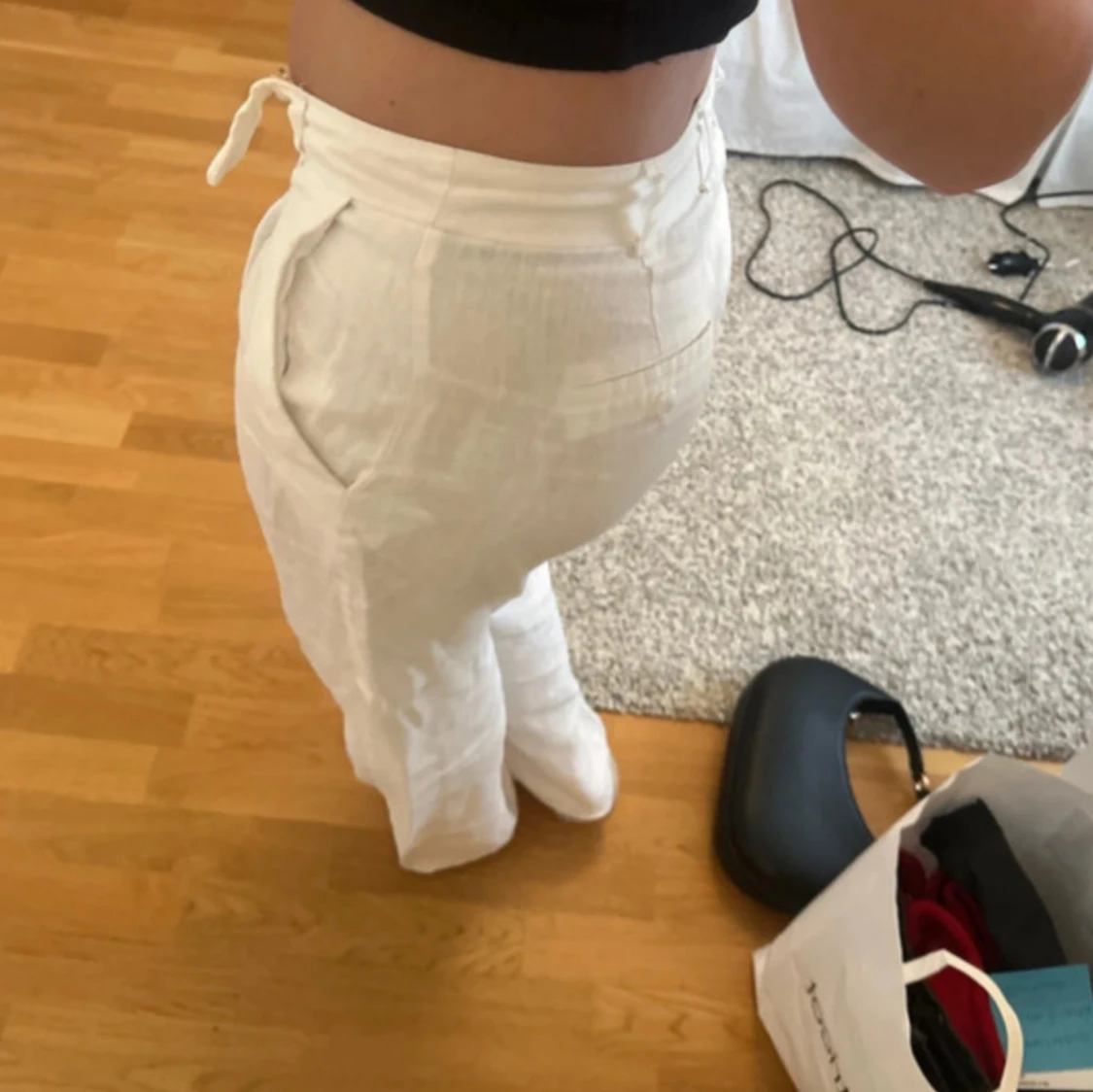 Snygga vita linnebyxor från NA-KD i storlek M. Byxorna är mid waist, har raka ben och stängs med dragkedja och hyska. Perfekta för en fräsch och chill look, med fickor på sidorna och skön passform. Säljer då jag inte kan knäppa dem för de blivit för små för mig 💓