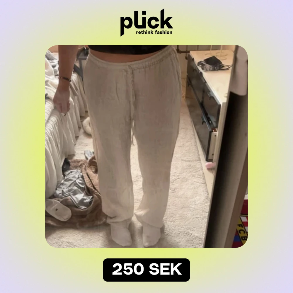 Linnebyxor, från nån butik nere i Spanien använt 2-3 gånger 100% linne Vet inte vad det är för storlek finns ingen lapp men jag är 170 å bär normalt s/m i storlekar