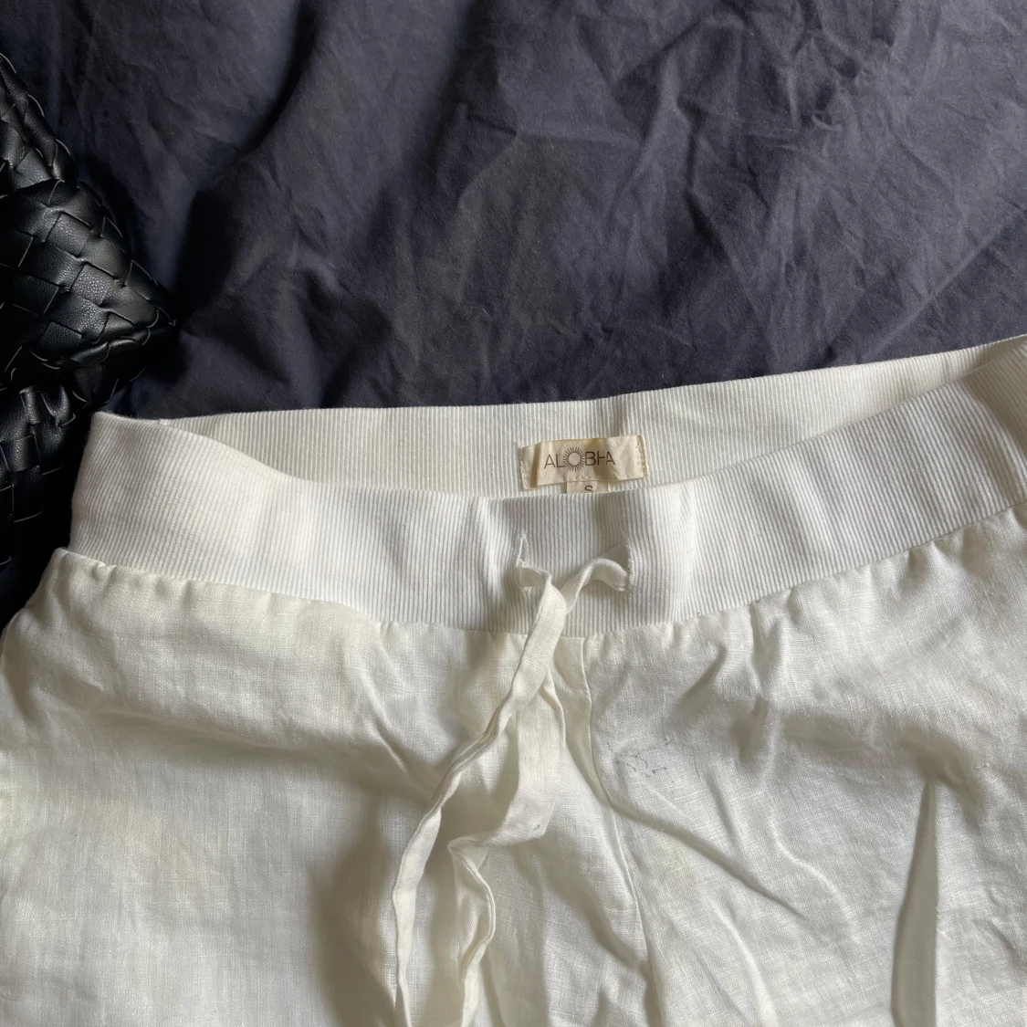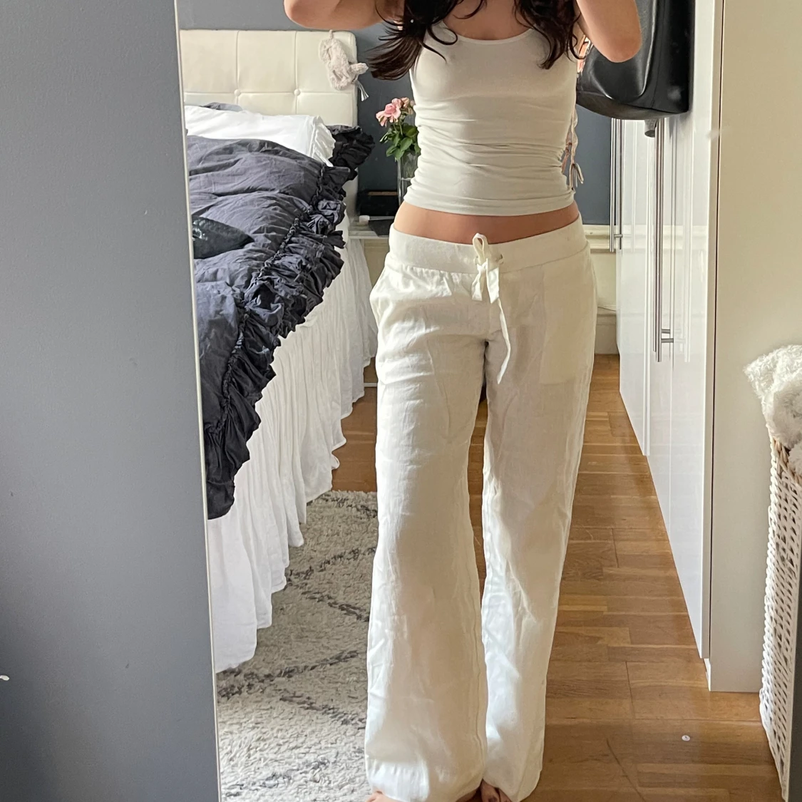 Använda en gång. Dom är upplagda för att passa mig som är 170cm till platta skor som ballerinas. Går lätt att ta ner uppläggningen om man vill ha tillbaka längden. Obs! De har en fläck precis vid snörena, se bild. Frakt ej inkluderat