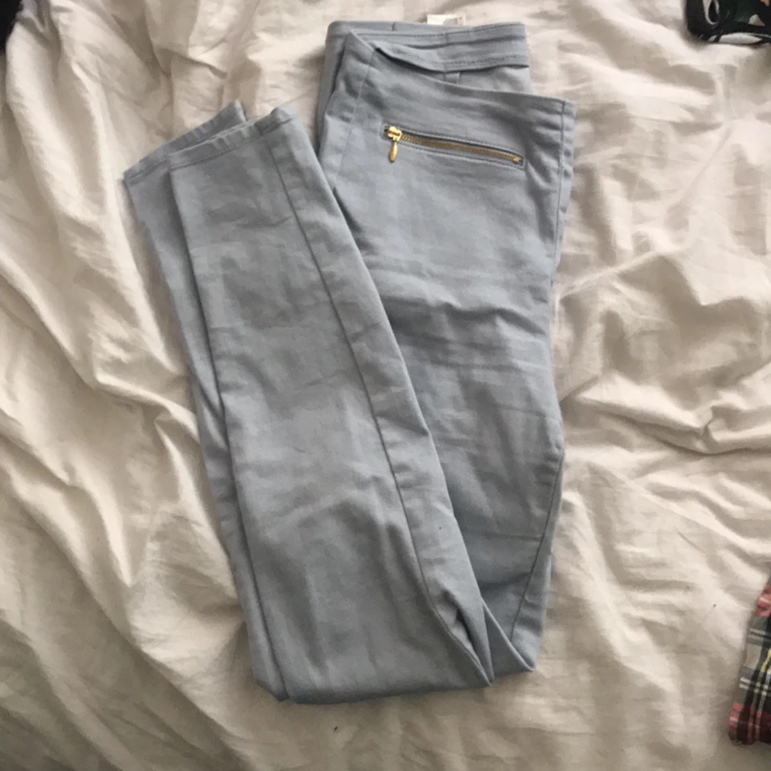 Ljusblå byxor med guld dragkedja. Knäppning i sidan.
