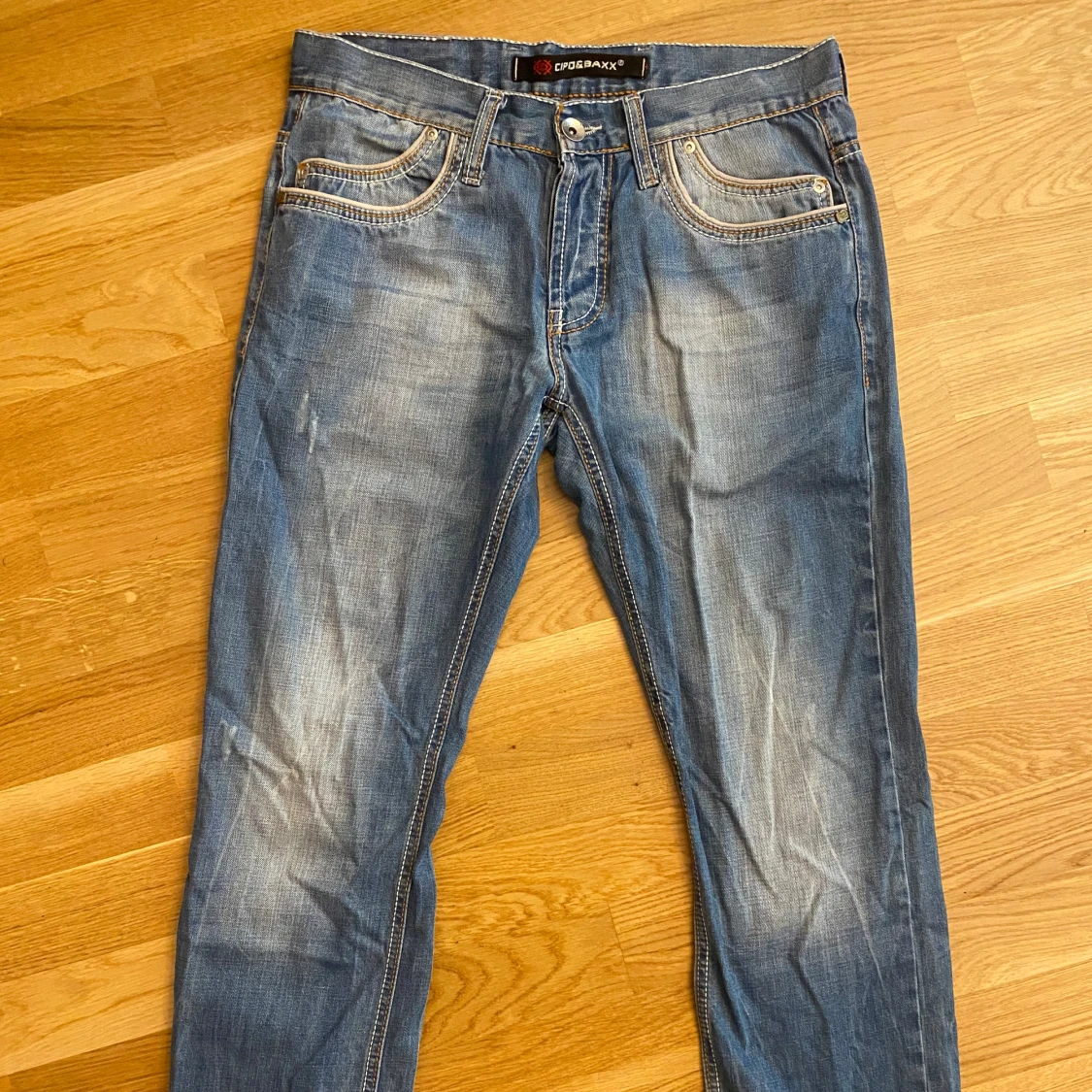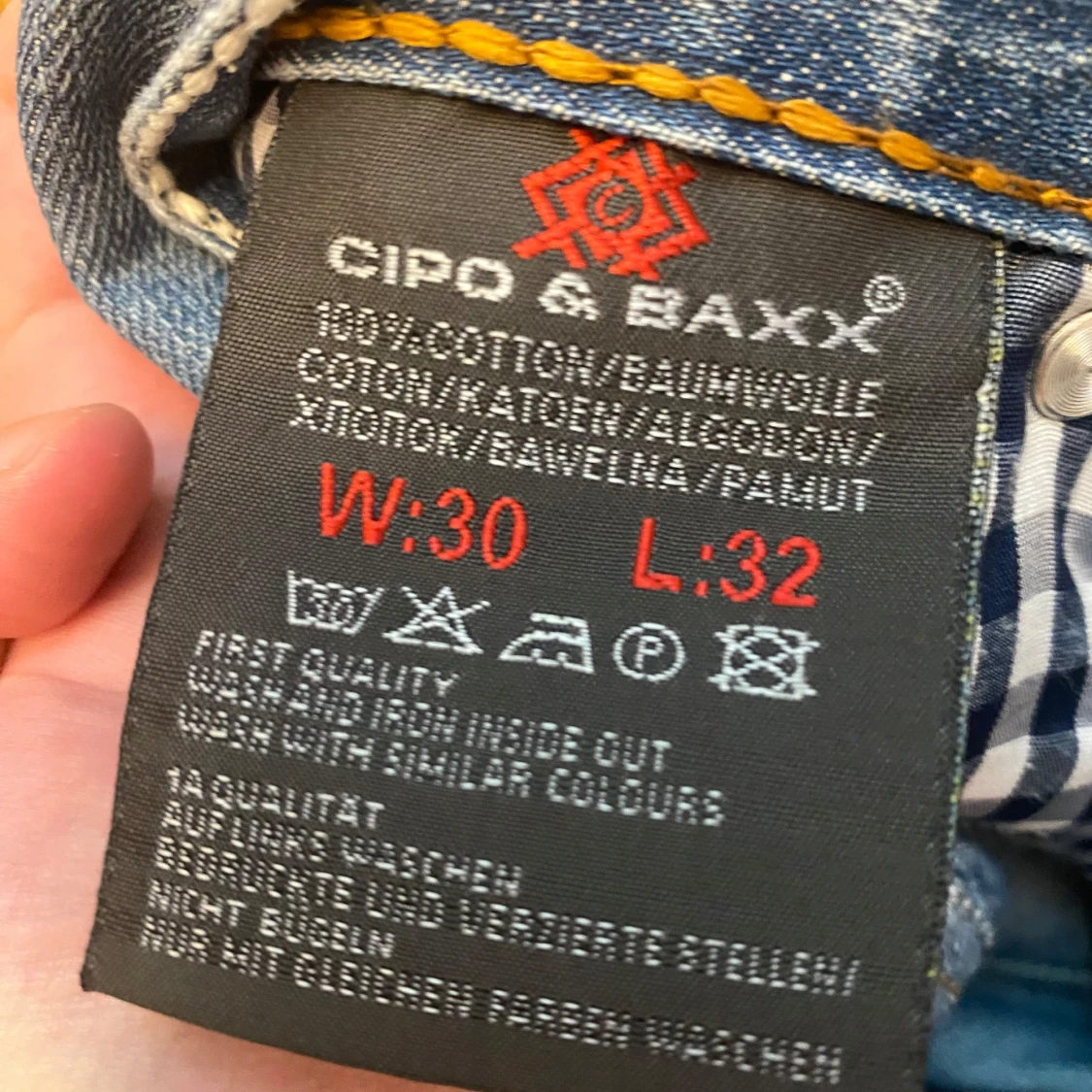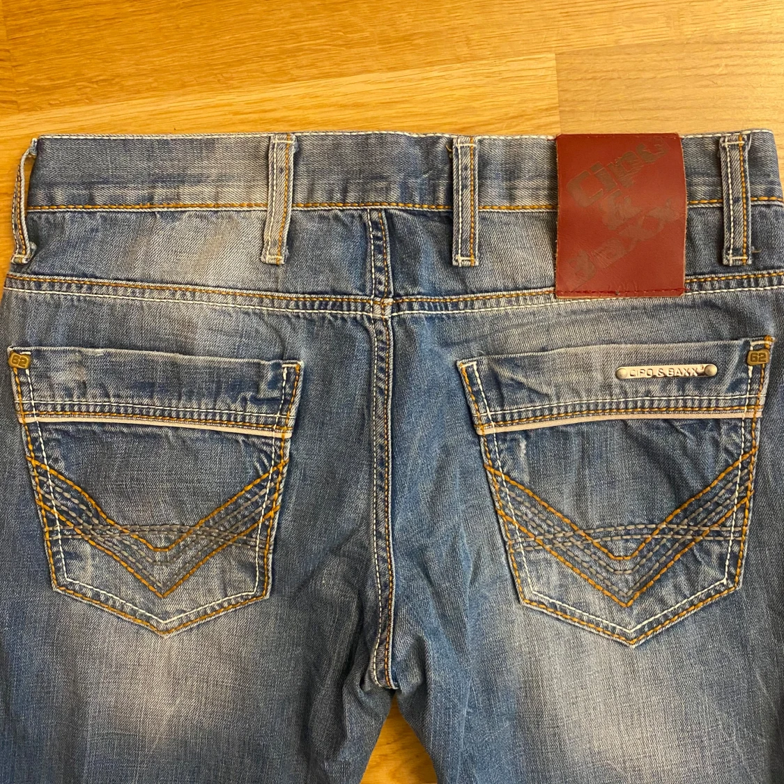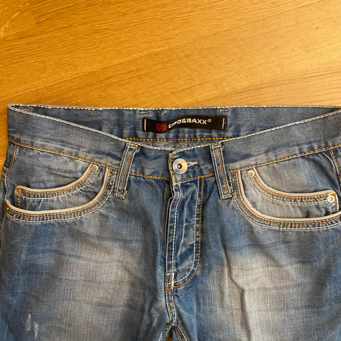 Snygga blå jeans från Cipo & Baxx med slitningar och kontrastsömmar. Klassisk femficksmodell, coola bakfickor med broderade detaljer och läderpatch i midjan. Jeansen har normal passform och är tillverkade i jeansmaterial.