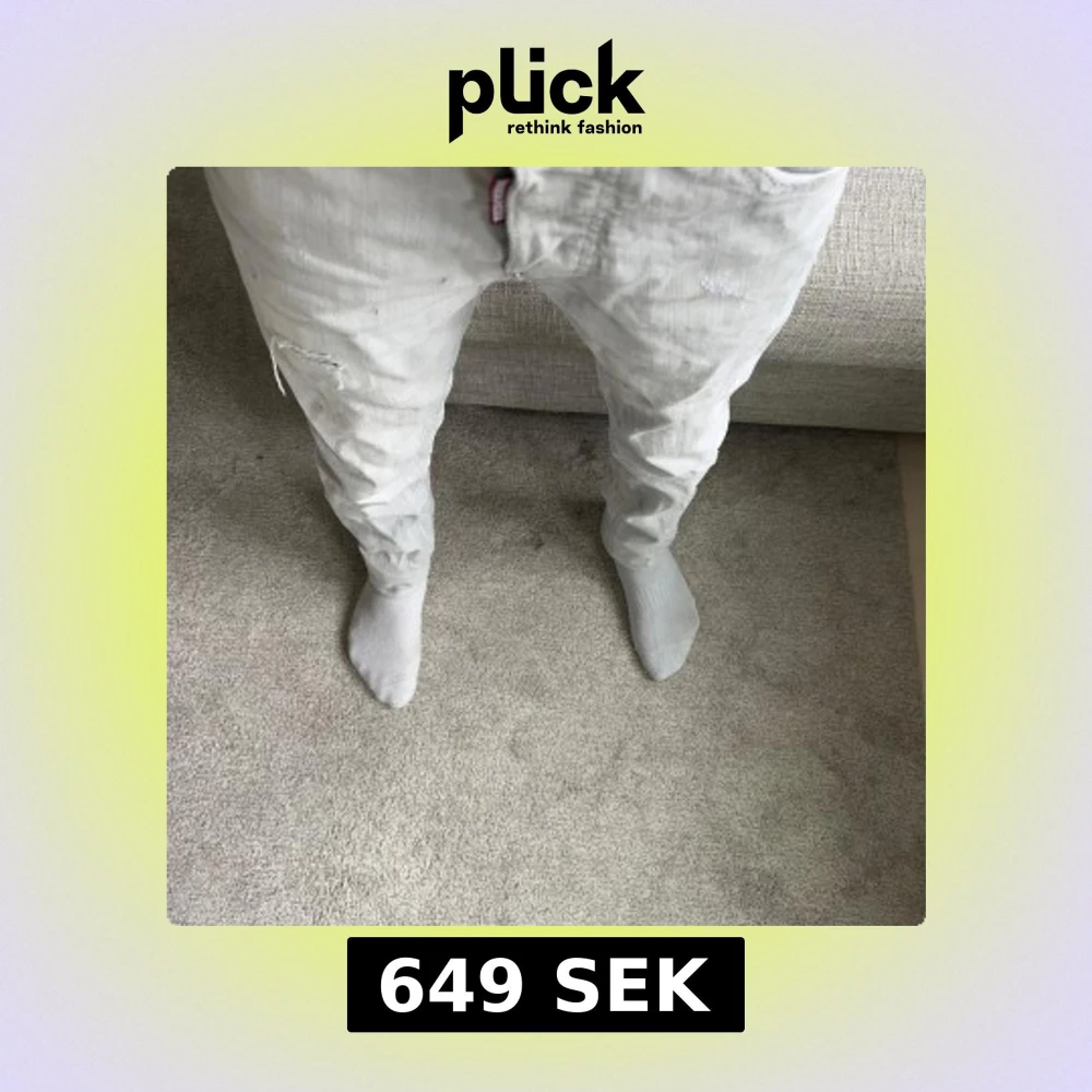 Säljer ett par ljusgrå jeans från Dsquared2 med klassisk femficksdesign och diskreta slitningar på benen. Jeansen har knappgylf och Dsquared2-logga vid gylfen. Perfekta för dig som gillar stilrena och trendiga jeans. De har målarfärg och utsuddad målarfärg som är en del av designen. Jag är 160 cm lång och som ni ser på bilderna passar de perfekt. Skriv om ni har några frågor