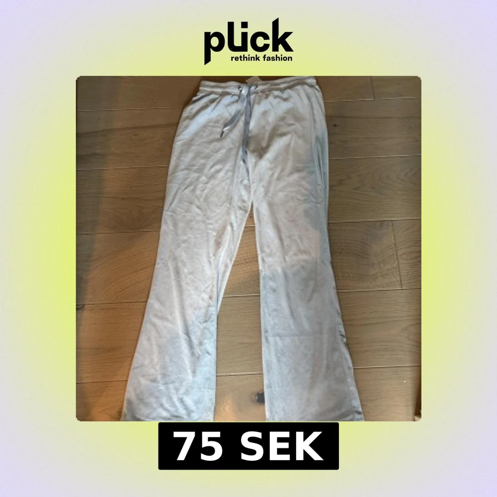 Säljer ett par ljusgrå mjukisbyxor med snörning i midjan. Byxorna har raka ben och är tillverkade i ett mjukt och bekvämt material, perfekta för chill dagar hemma eller när du vill vara extra comfy.