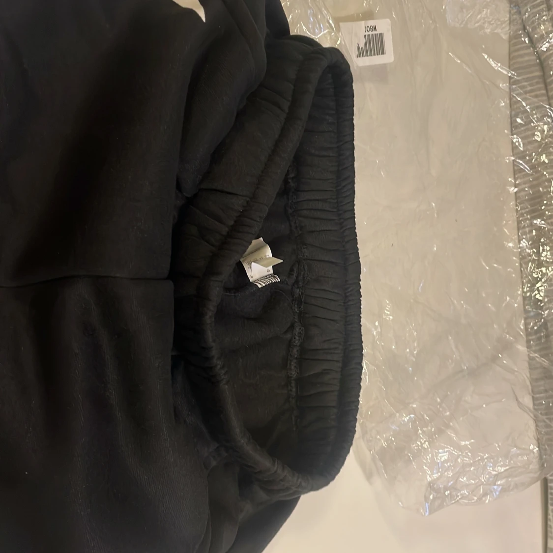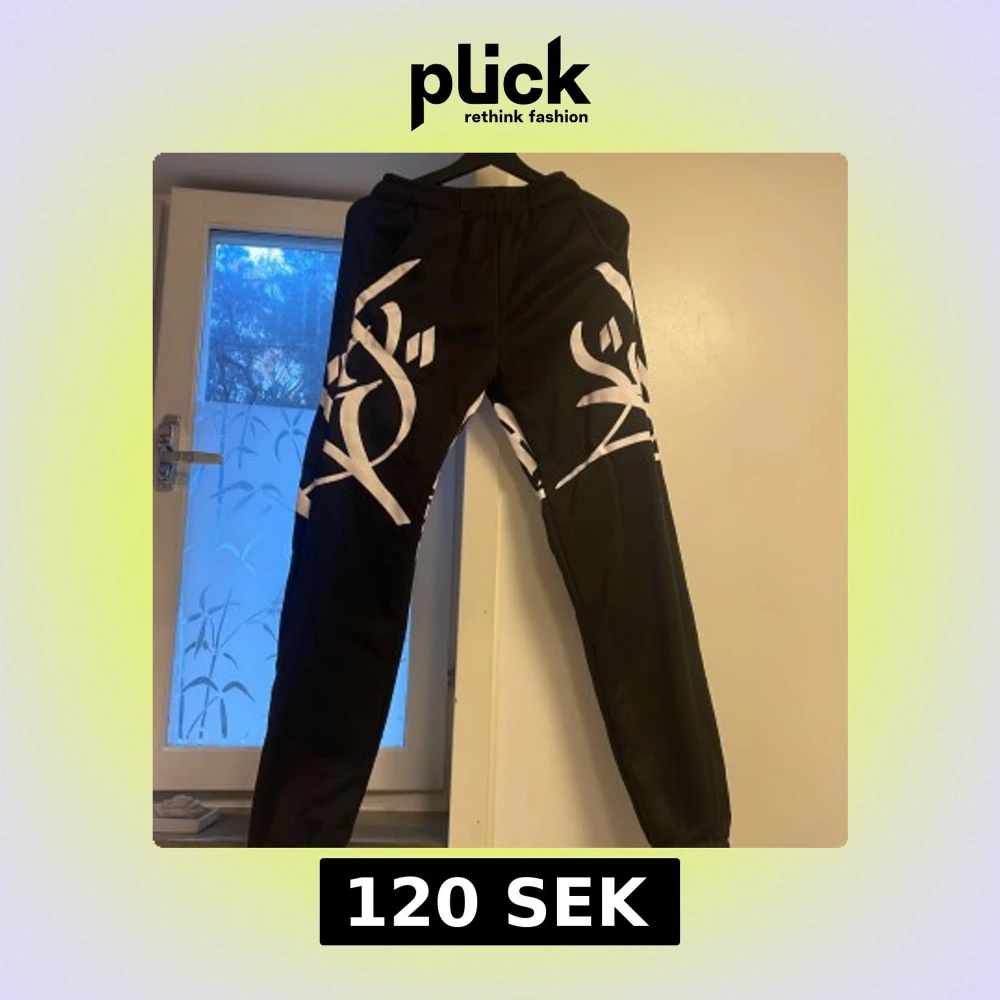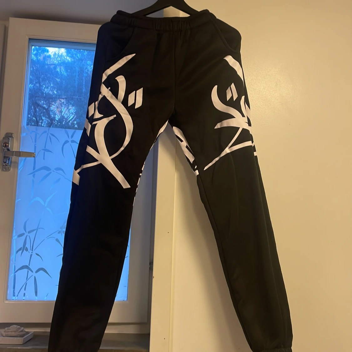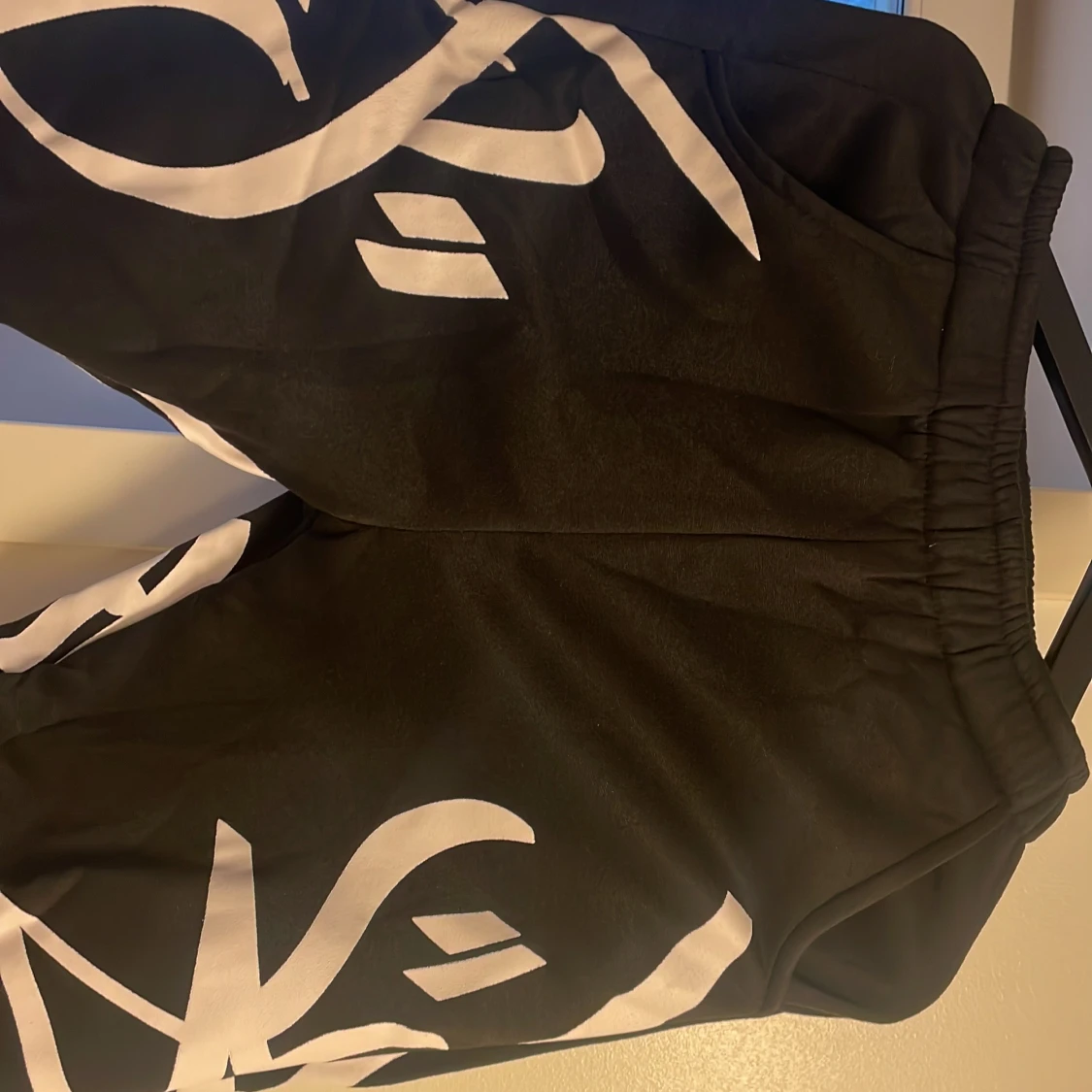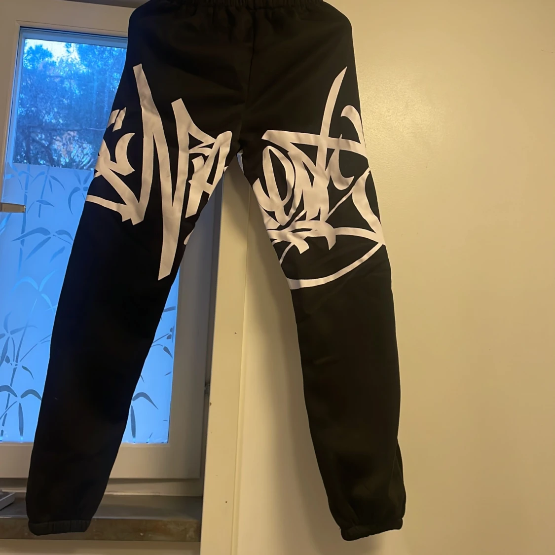 Nya svarta mjukisbyxor med stora vita grafiska tryck längs benen. Byxorna har resår i midjan och vid bensluten för en skön och avslappnad passform. Perfekta för chill dagar eller streetwear-stil. Materialet känns mjukt och bekvämt. Oanvända. Har mindre passform än normalt, passar också dig som har stl S.